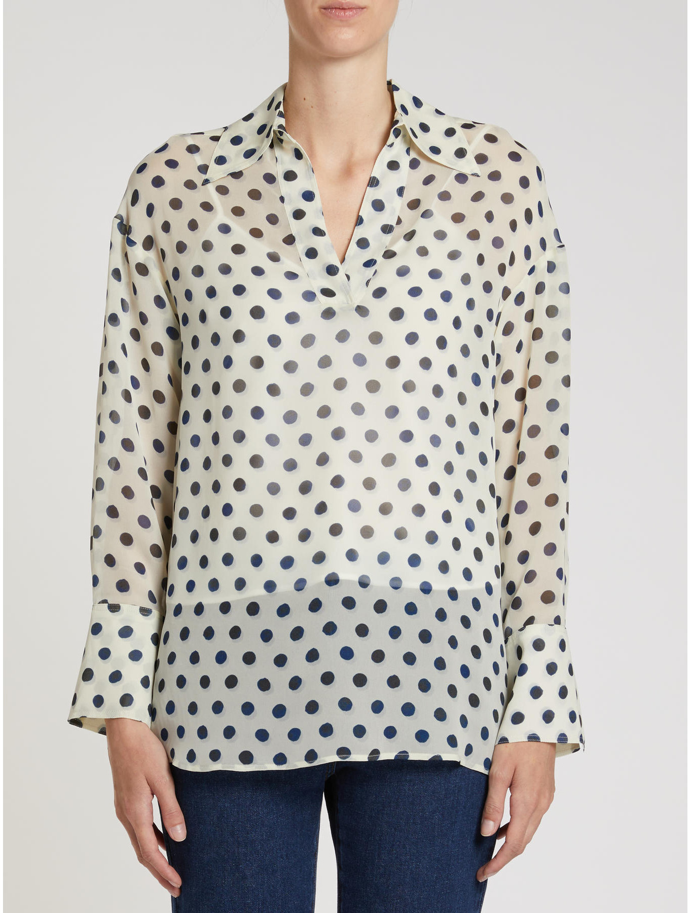 Oversized polo shirt in polka-dot georgette. Featuring a man's collar with an open stand and a V-neckline. Straight and relaxed fit with dropped shoulders, it features a yoke at the back with a box pleat. Long sleeves with high cuffs that fasten with a button at the top and a teardrop cuff. Length: 70 cm. Featuring wide side slits.