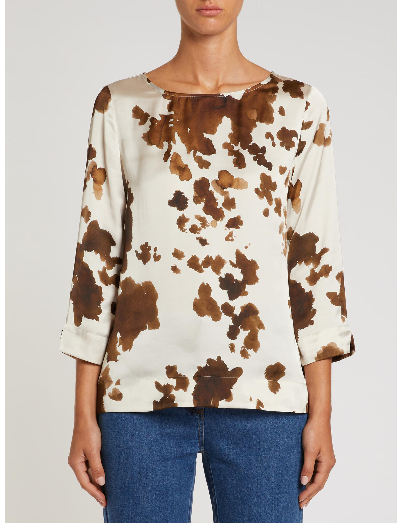 Flowing satin blouse. Straight fit. Rounded boat neckline. Three-quarter sleeves. Slits at the cuffs and hem. Regular fit.