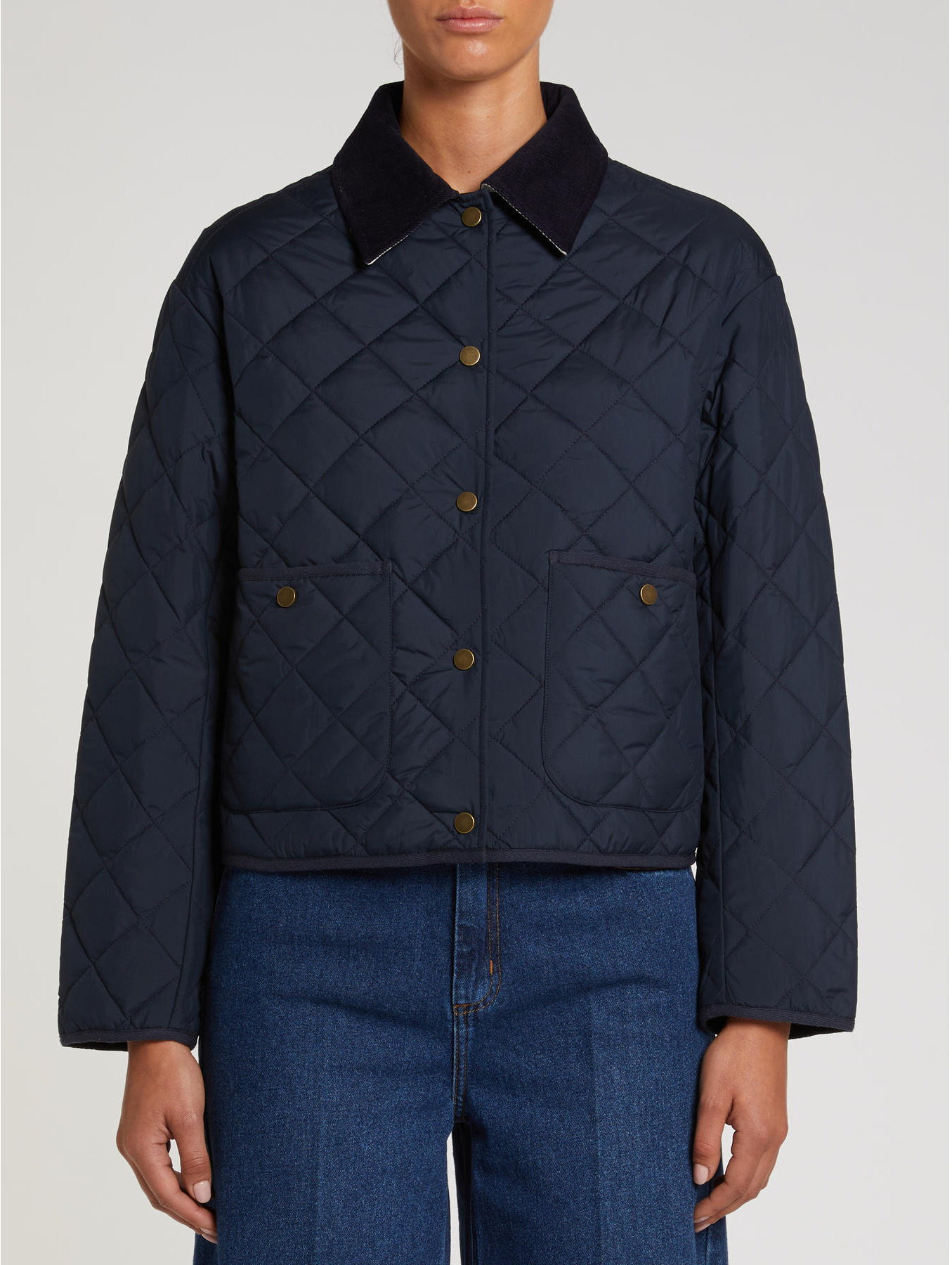 Water-repellent technical fabric. Diamond stitching. Straight fit. Corduroy collar. Dropped shoulders. Patch pockets. Snap button closure. Finished with bound hems. Striped yarn-dyed cotton body lining.