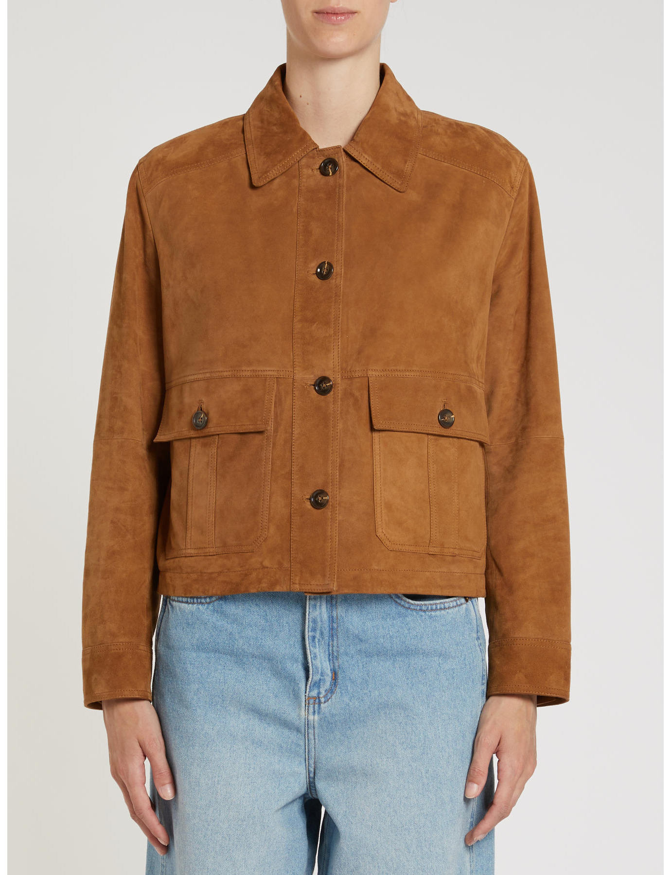 Leather with a buffed finish. Shirt collar and cuffs. Patch pockets with flaps. Button closures. Lined.