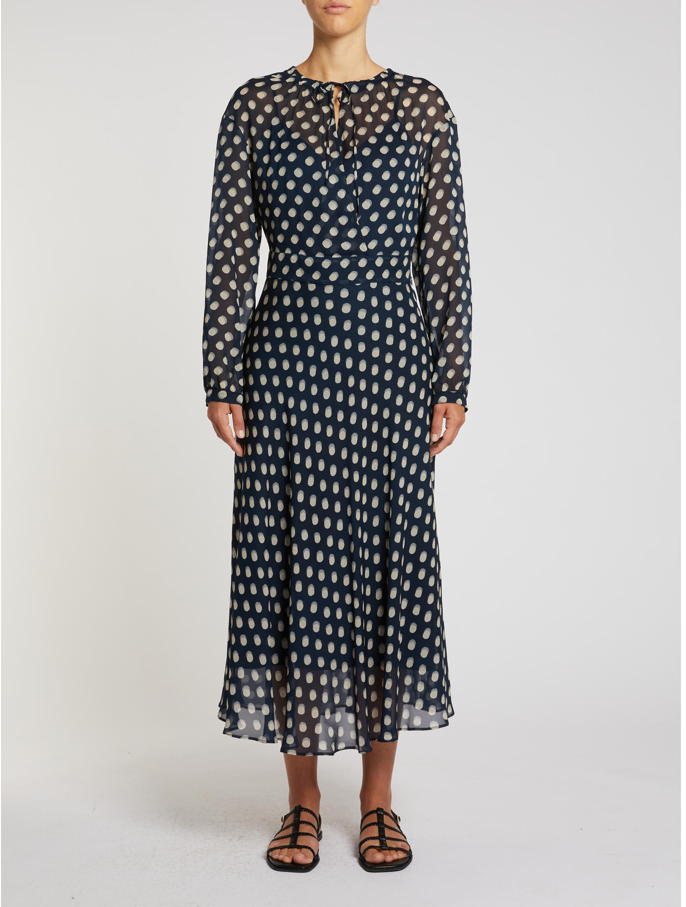 Long dress with a fitted waist and flared hem in polka dot georgette. It has a loose fit with a cinched waistband. A pleated skirt extends from the waist, adding a fuller hem. Long sleeves with gathered cuffs that close with a button. Round neckline with a stitched and gathered motif that continues with straps that tie with a bow at the front to adjust the front opening. Dress comes with a slip.