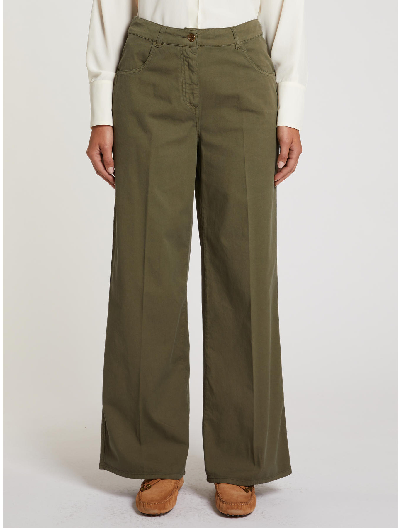 Garment-dyed stretch cotton piqué. Straight leg. Regular waist with belt loops. Rounded front pockets and patch pockets at the back. Concealed zip and button closure. Loose fit.