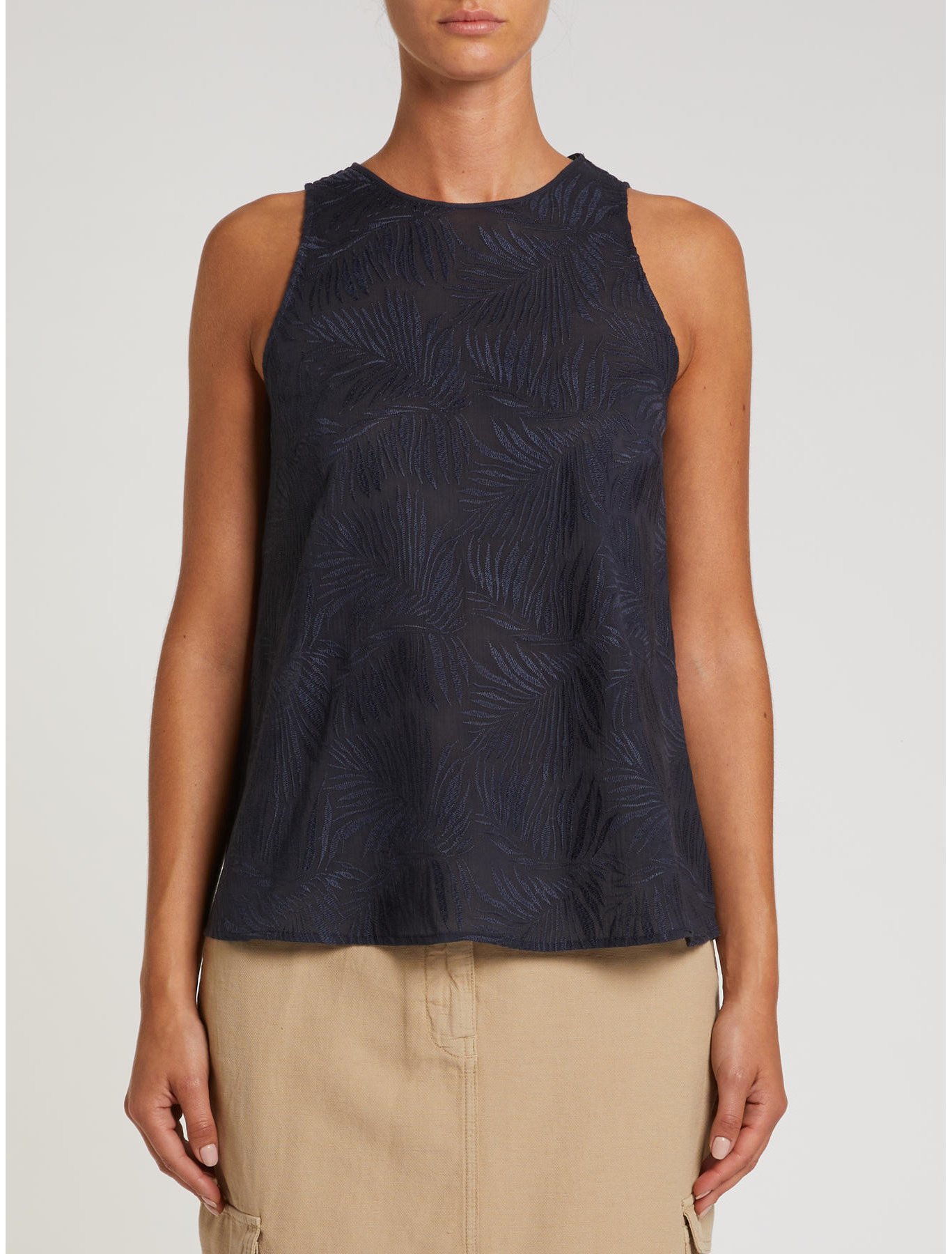 Perfect under a blazer in the city or over shorts on vacation, this top enhances the lightness of muslin with matching embroidered palm leaves.