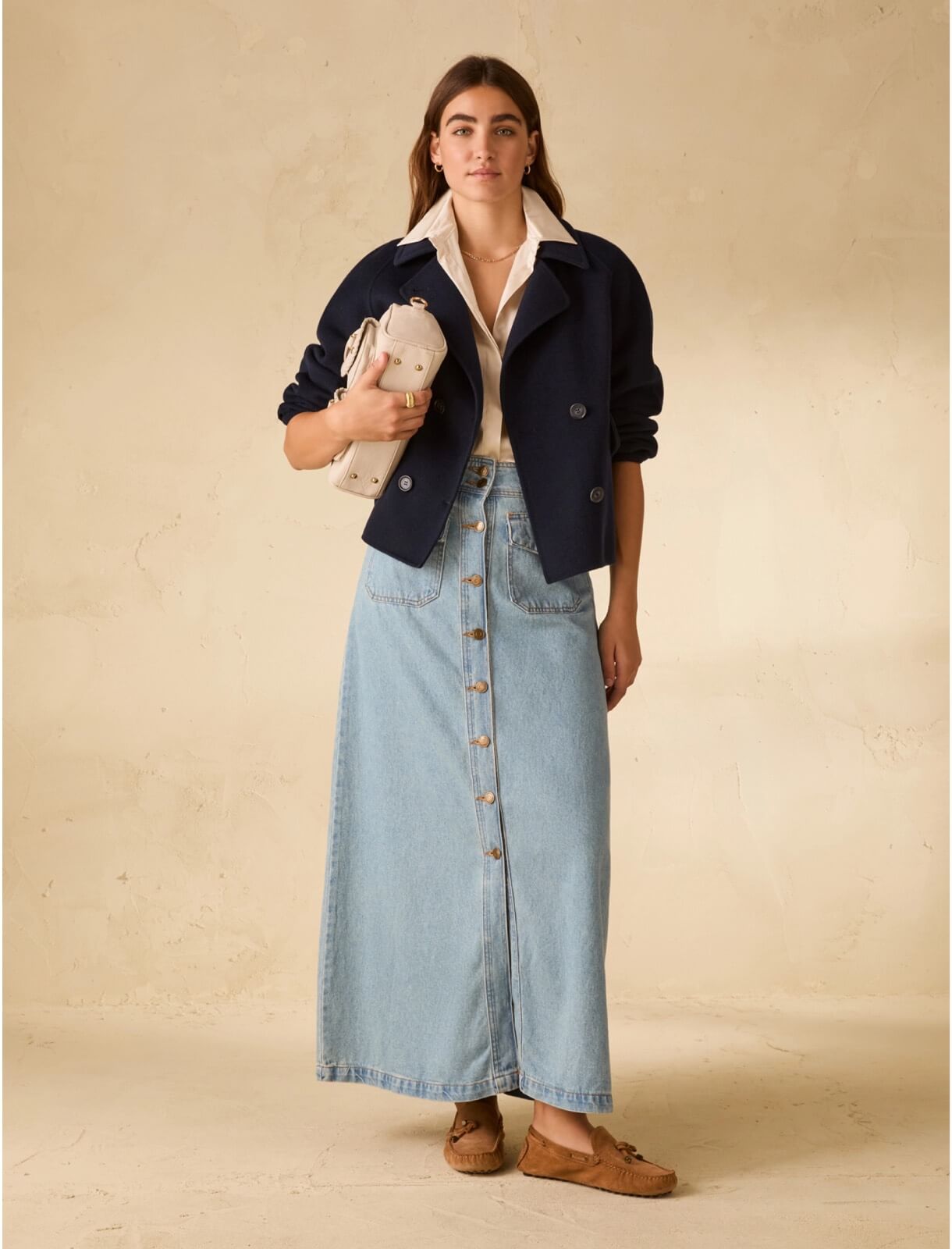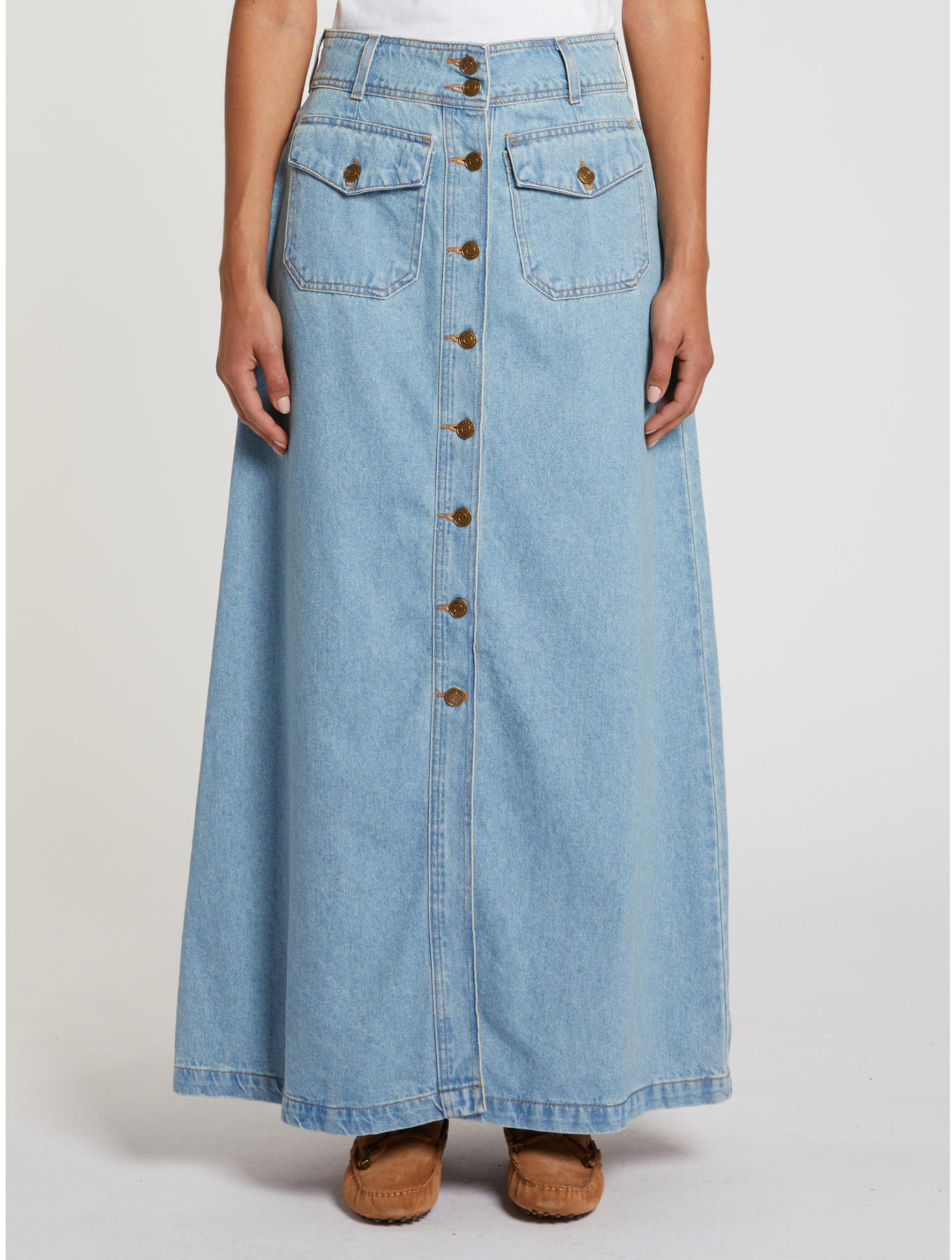 With a safari-inspired design in faded denim, this skirt is the perfect interpretation of modern casual chic.