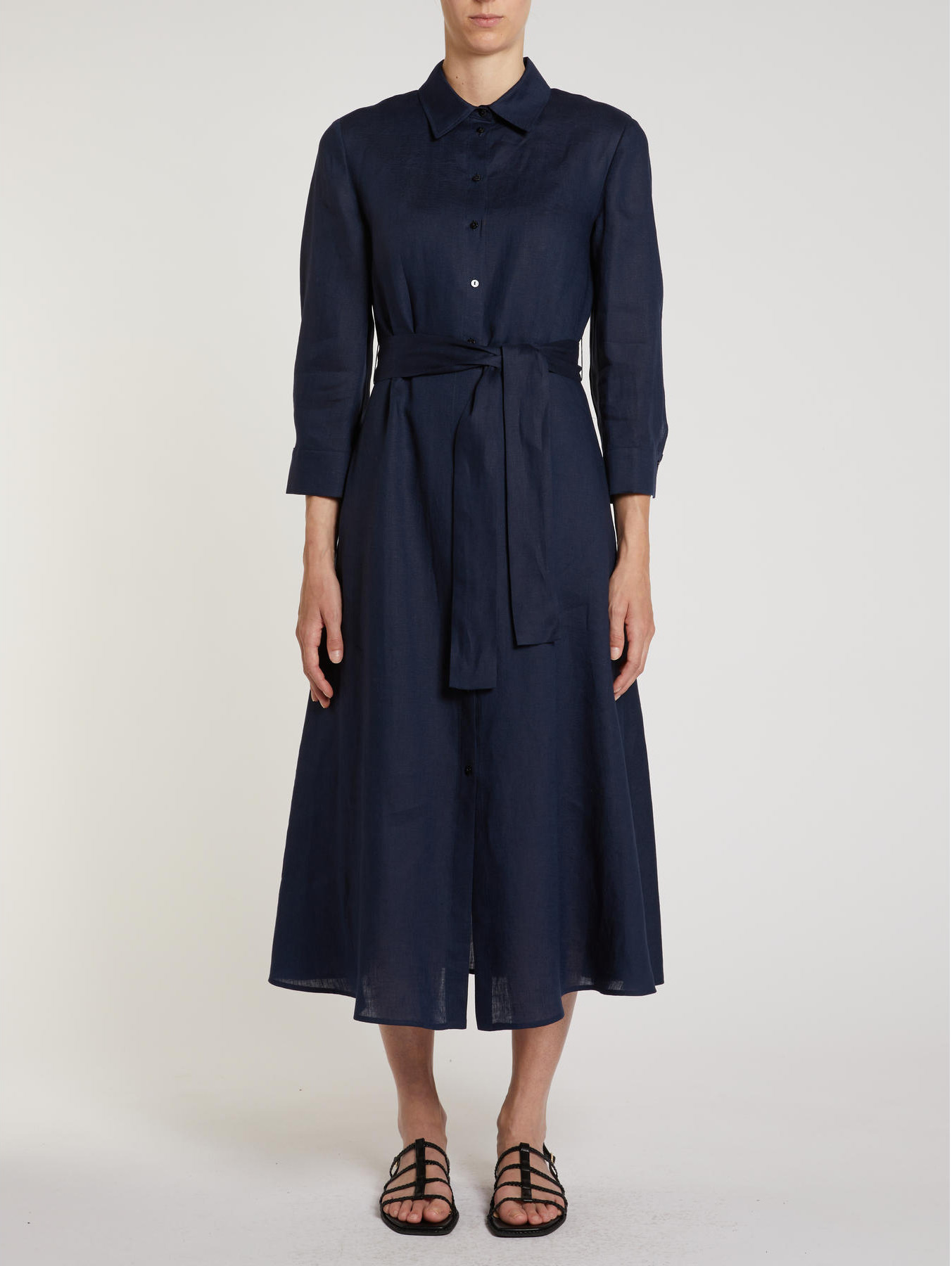 Pure linen. Classic collar, three-quarter sleeves, and buttoned cuffs. Matching tie belt. Inset side pockets. Complete with a cotton muslin slip. Fitted at the bust, flared at the hem.