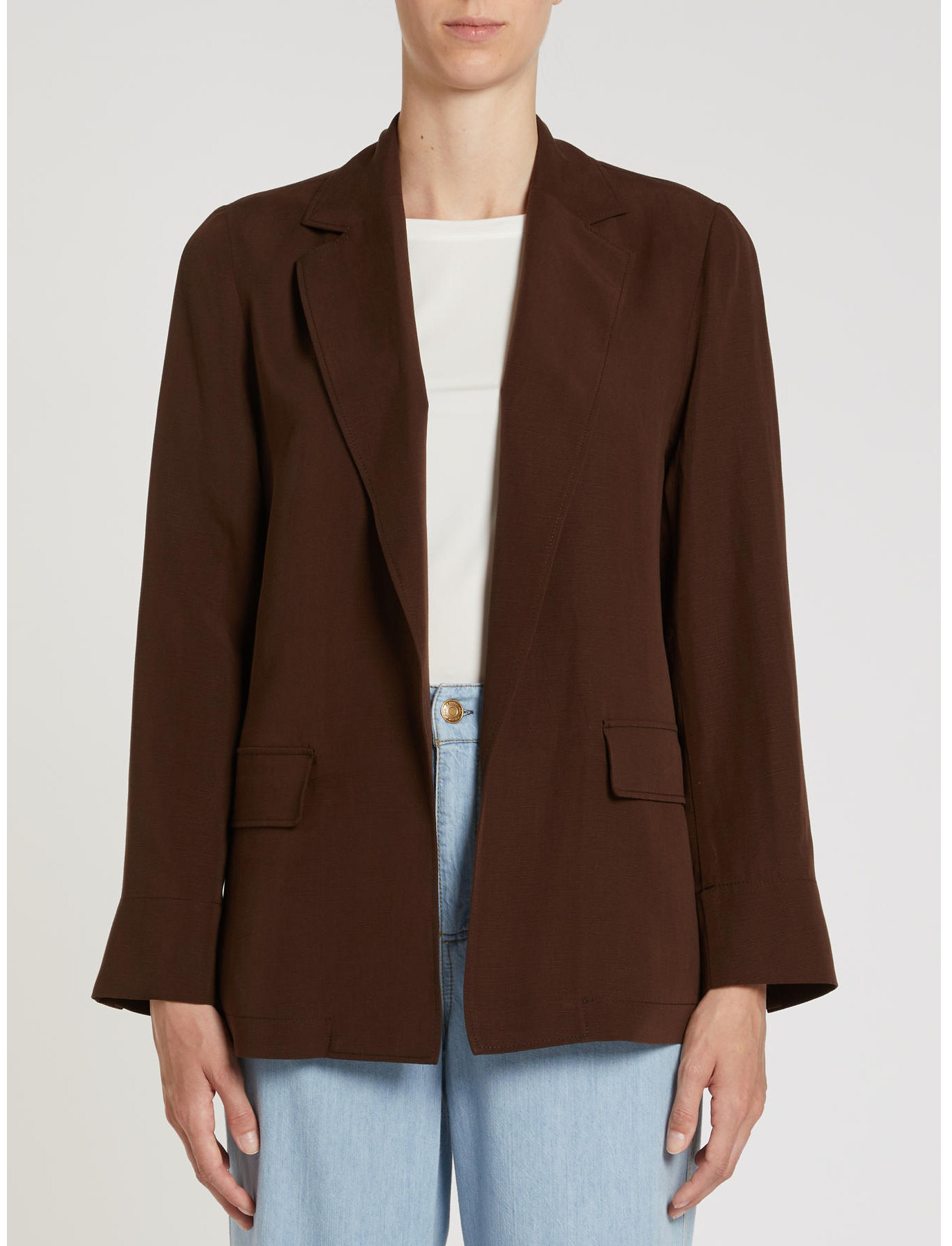 Slub fabric in lyocell and linen. Straight fit, single-breasted without buttons. Deep lapels. Front flap pockets. Cuff vents. Unlined. Matching trousers in the collection. Regular fit.
