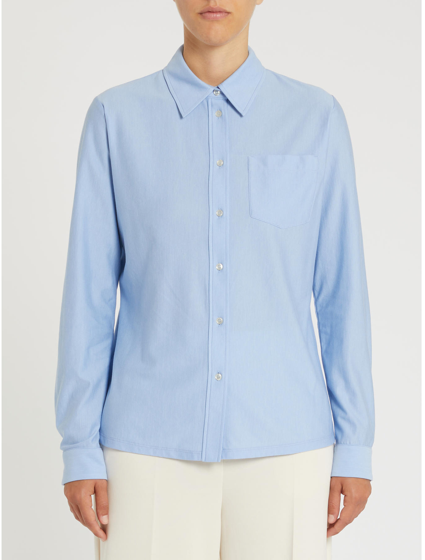 Yarn-dyed cotton jersey. Classic collar, long sleeves, and buttoned cuffs. Patch pocket on the front. Slim fit.