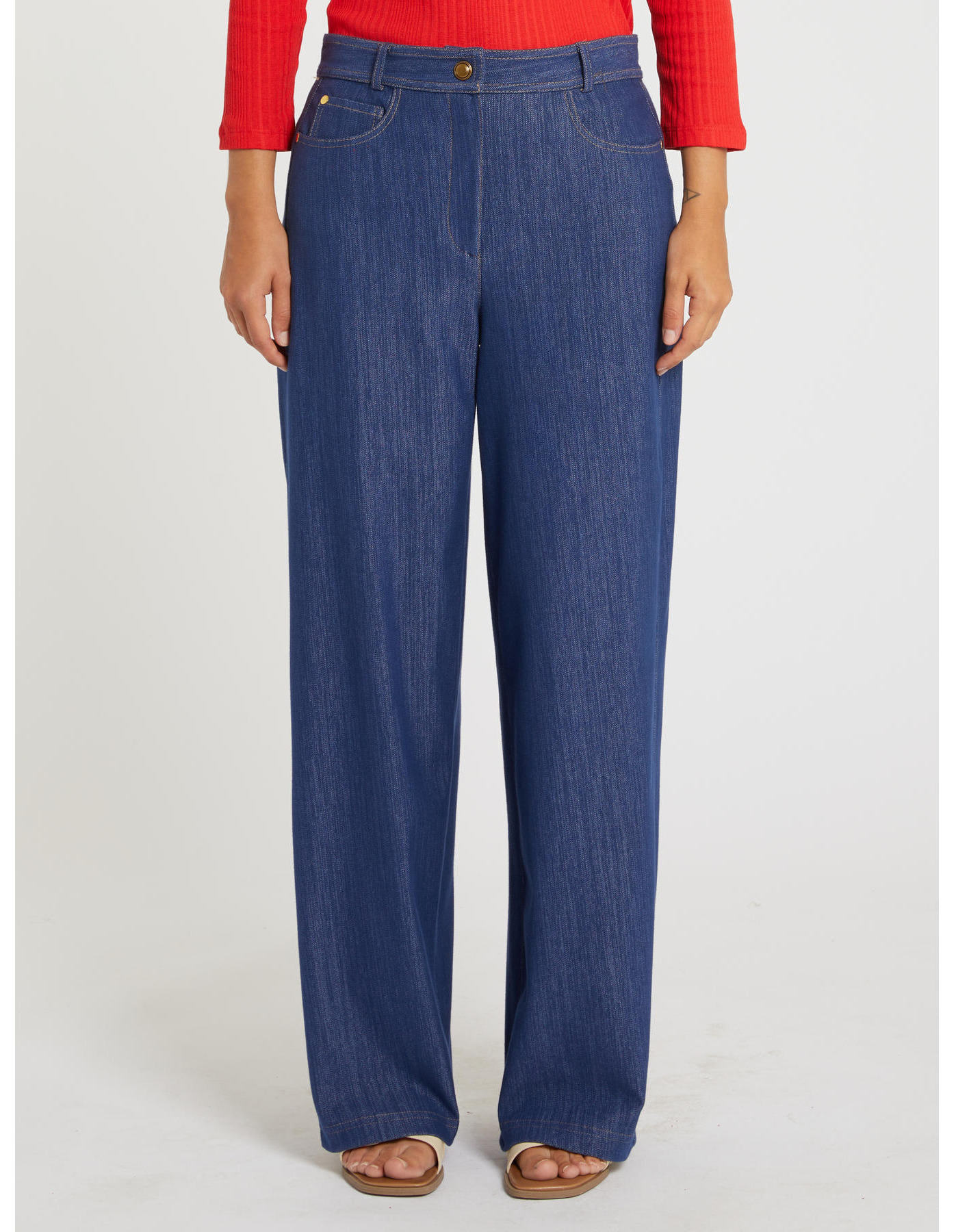 Stretch cotton blend jersey with a denim effect. Straight leg. Regular waist with belt loops. Five-pocket design. Concealed zip and snap button closure. Contrasting stitching. Matching shirt jacket from the collection. Loose fit.