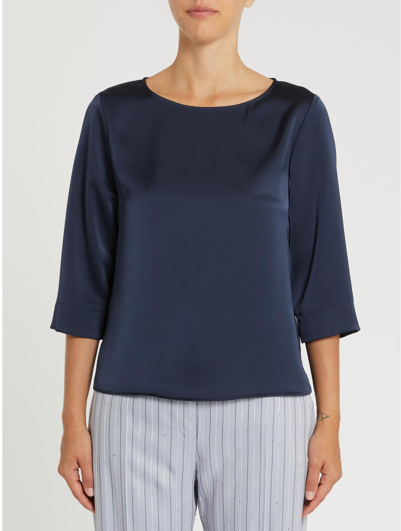 Double satin blouse. Slightly flared lines. Round neckline. Three-quarter sleeves. Slits at the cuffs and hem.
