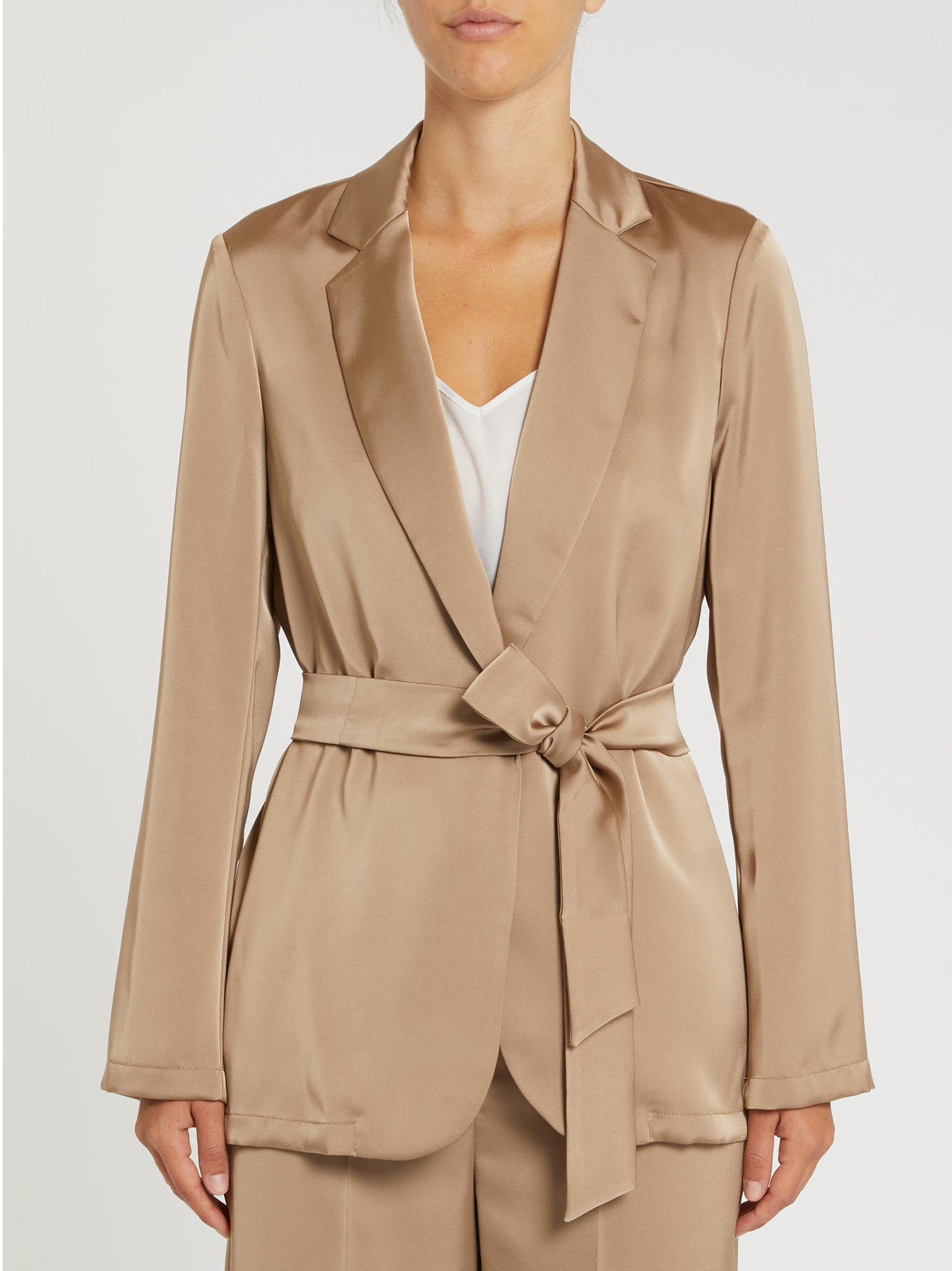 Double satin. Single-breasted, one-button design. Lapel collar. Fabric-covered button. Matching belt to tie at the waist. Unlined. Matching top, blouse, skirt, and pants in the collection. Regular fit.