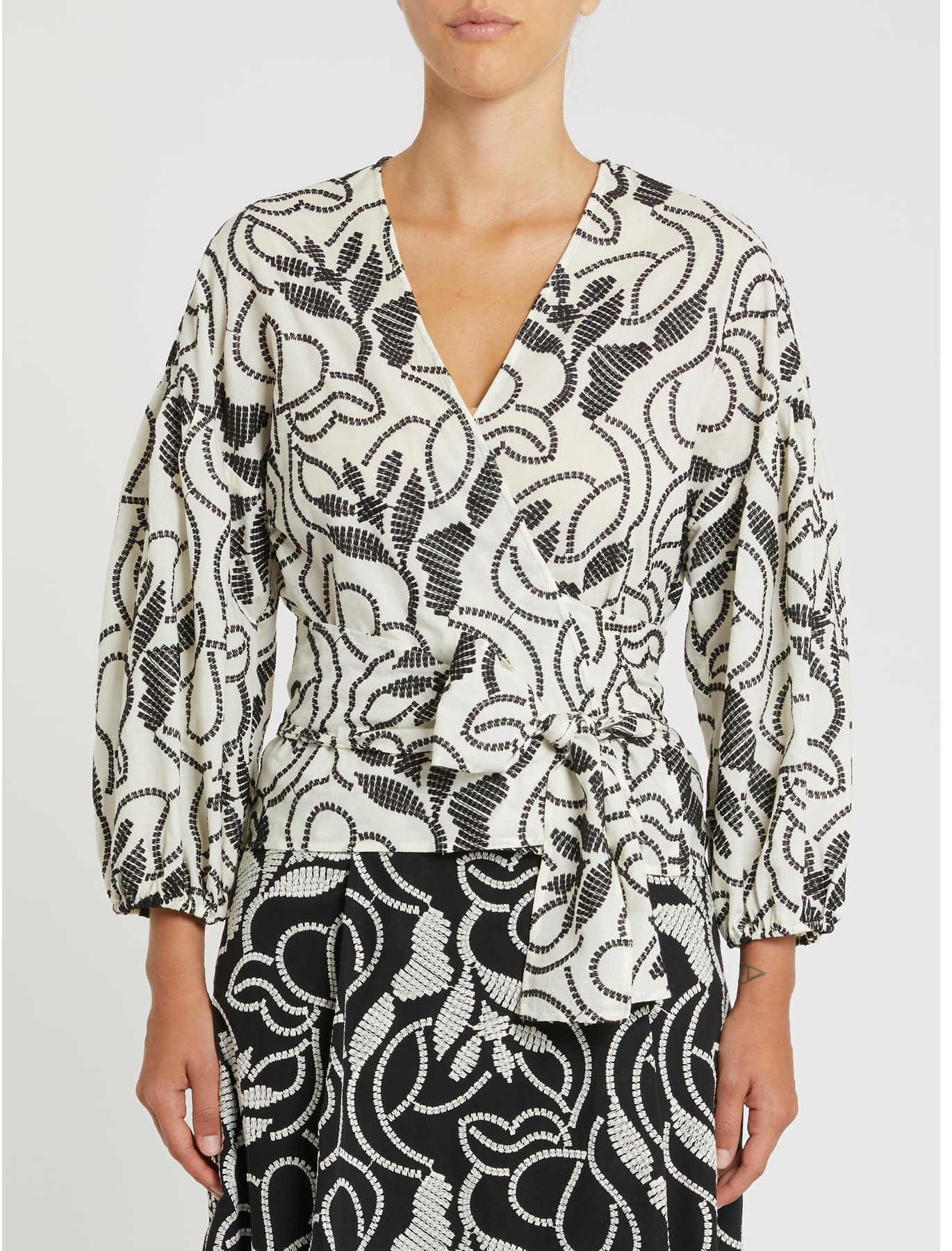 Embroidered cotton muslin. Slightly flared lines. Wrap-over design. Tie sash at the waist. V-neck. Dropped shoulders. Puff sleeves with elastic cuffs.
