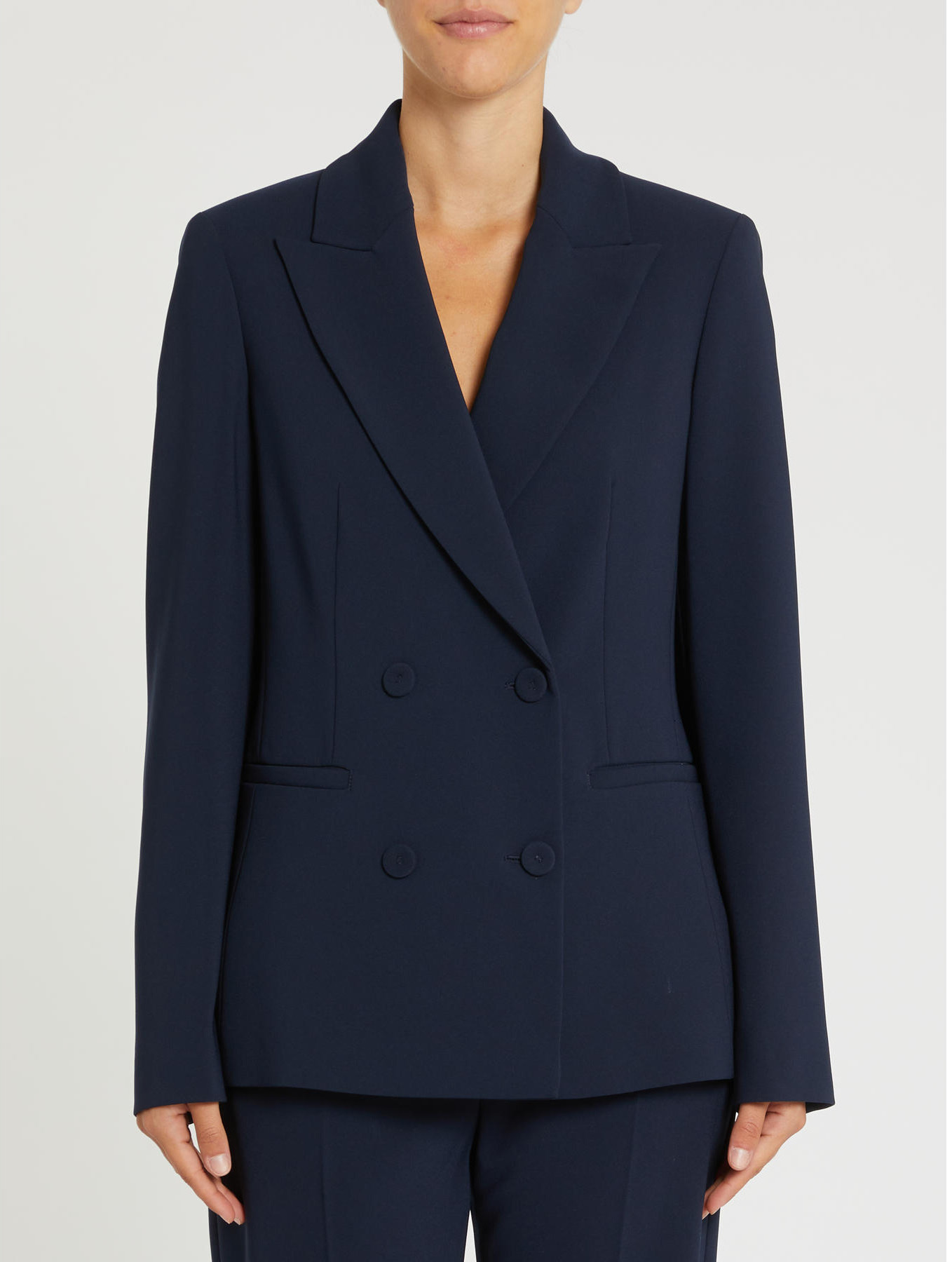 Two-way stretch cady. Double-breasted fit. Lines that skim the body. Peak lapels. Welt pockets. Lined.