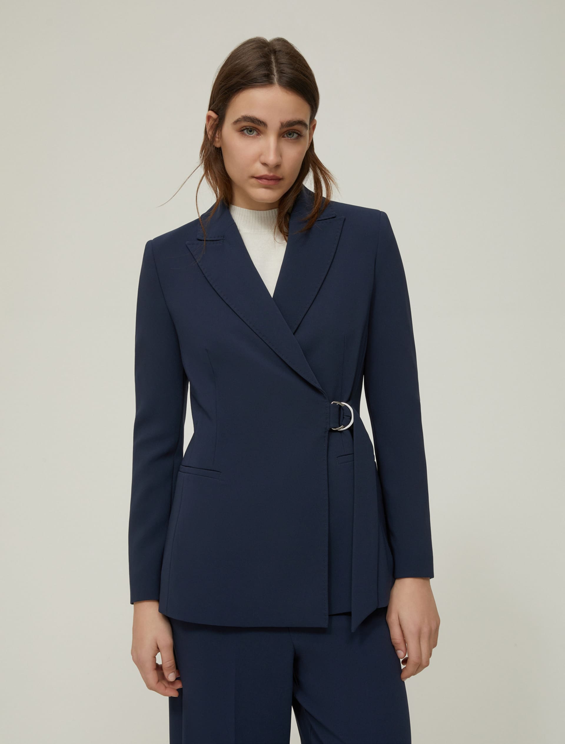 Bi-stretch cady. Slim fit. Overlapping fastening with lace and metal buckle. Structured shoulders. Wide peak lapels. Welt pockets. Tonal tailored stitching on the front. Lined garment. Coordinated trousers in the collection
