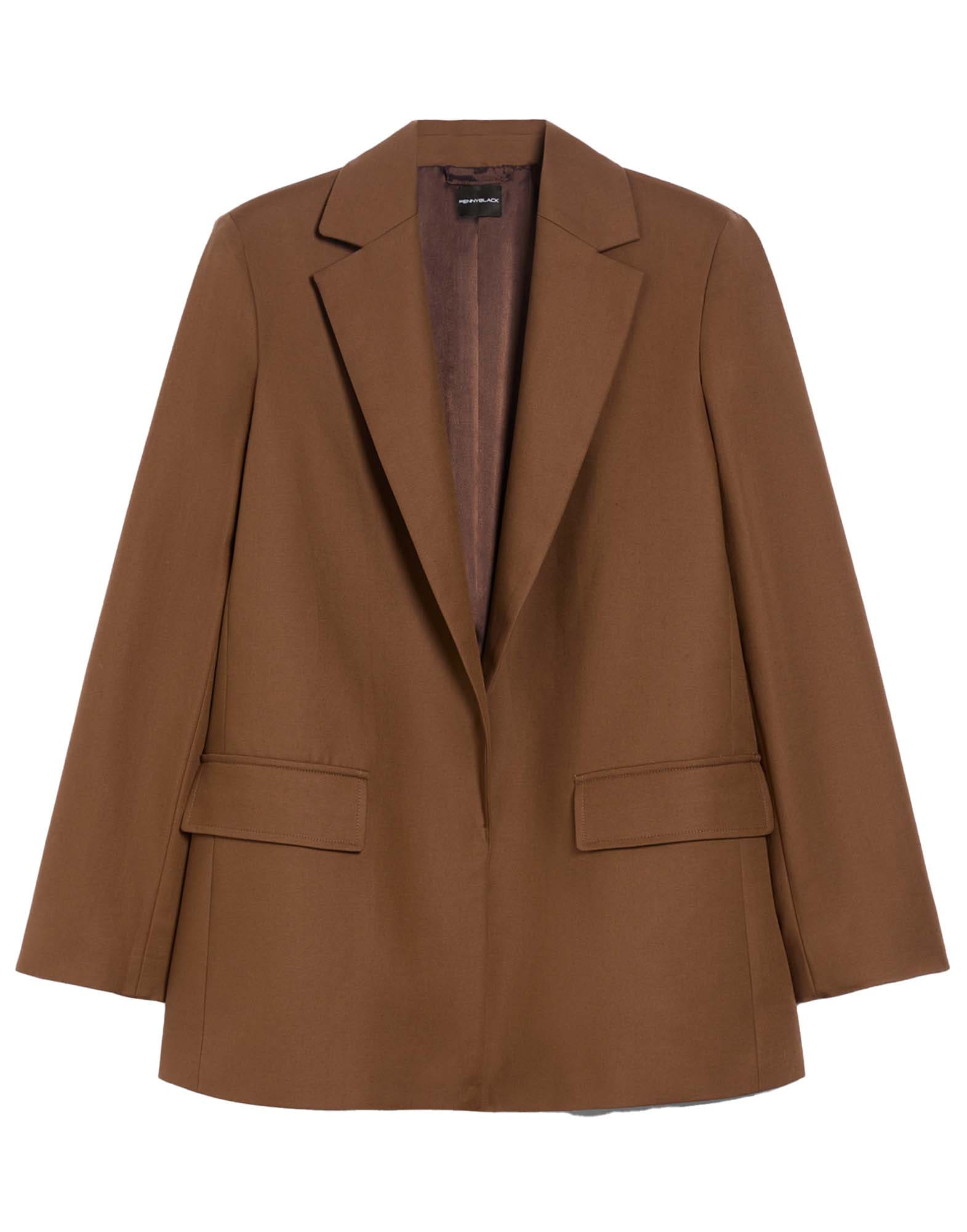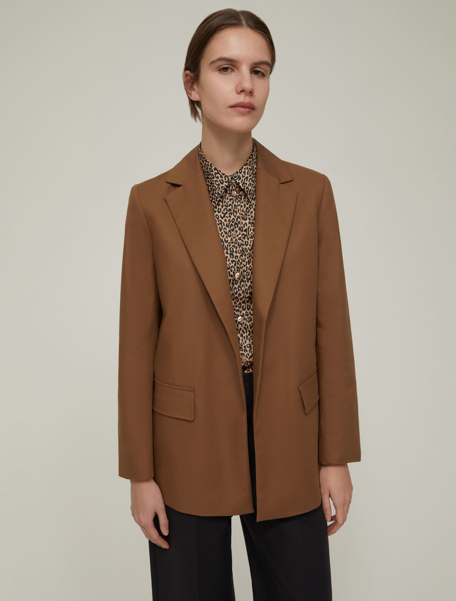 Stretch cotton with double weave. Single-breasted cut without buttons. Straight lines. Deep lapels. Flap pockets. Cuff vents. Lined garment. Matching trousers in the collection