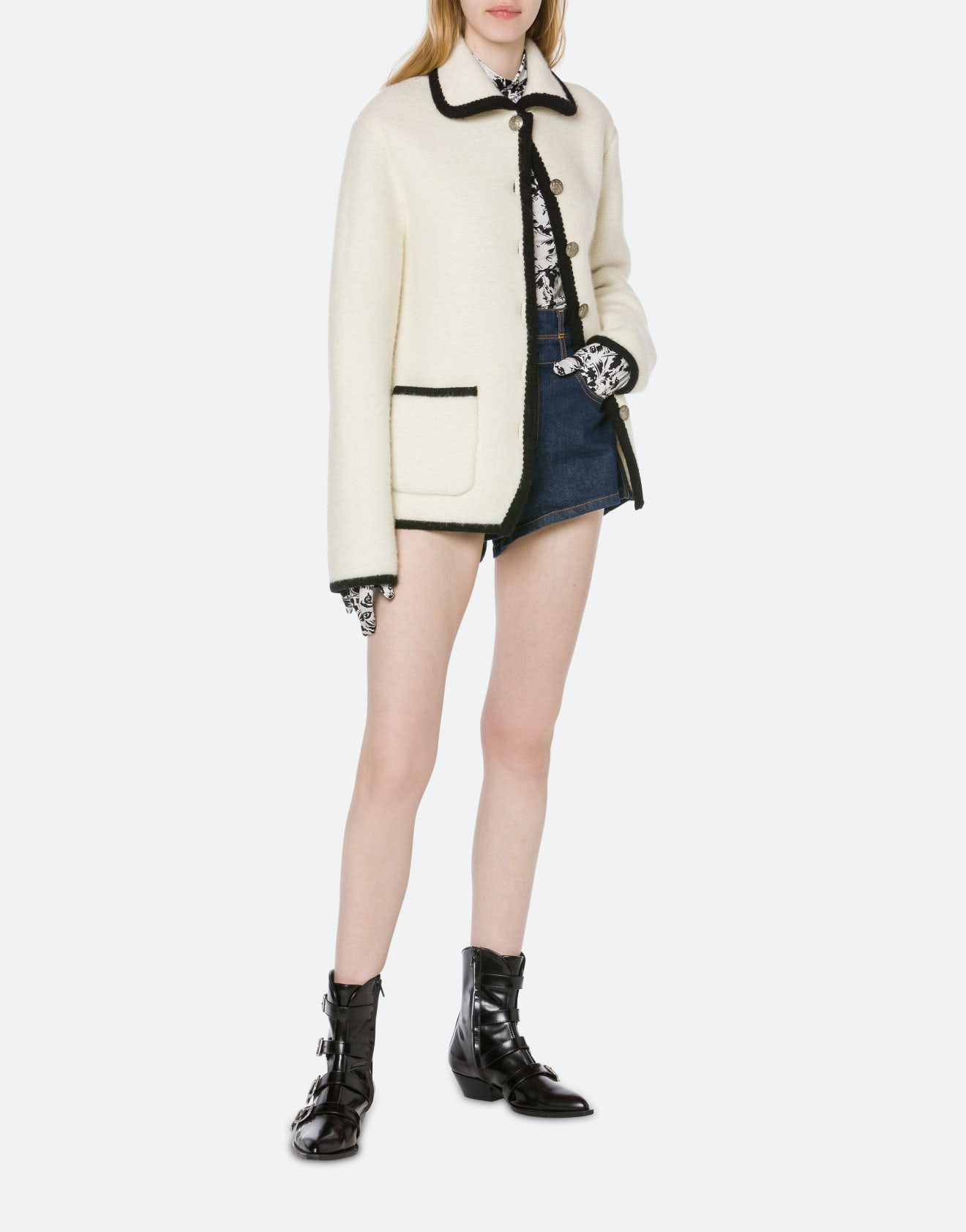 Extra fine merino wool jacket with contrasting edges. The military-style metal buttons emphasize the straight line of the silhouette. Two pockets on the front, profiles in wool, dropped shoulders, front closure with metal buttons.