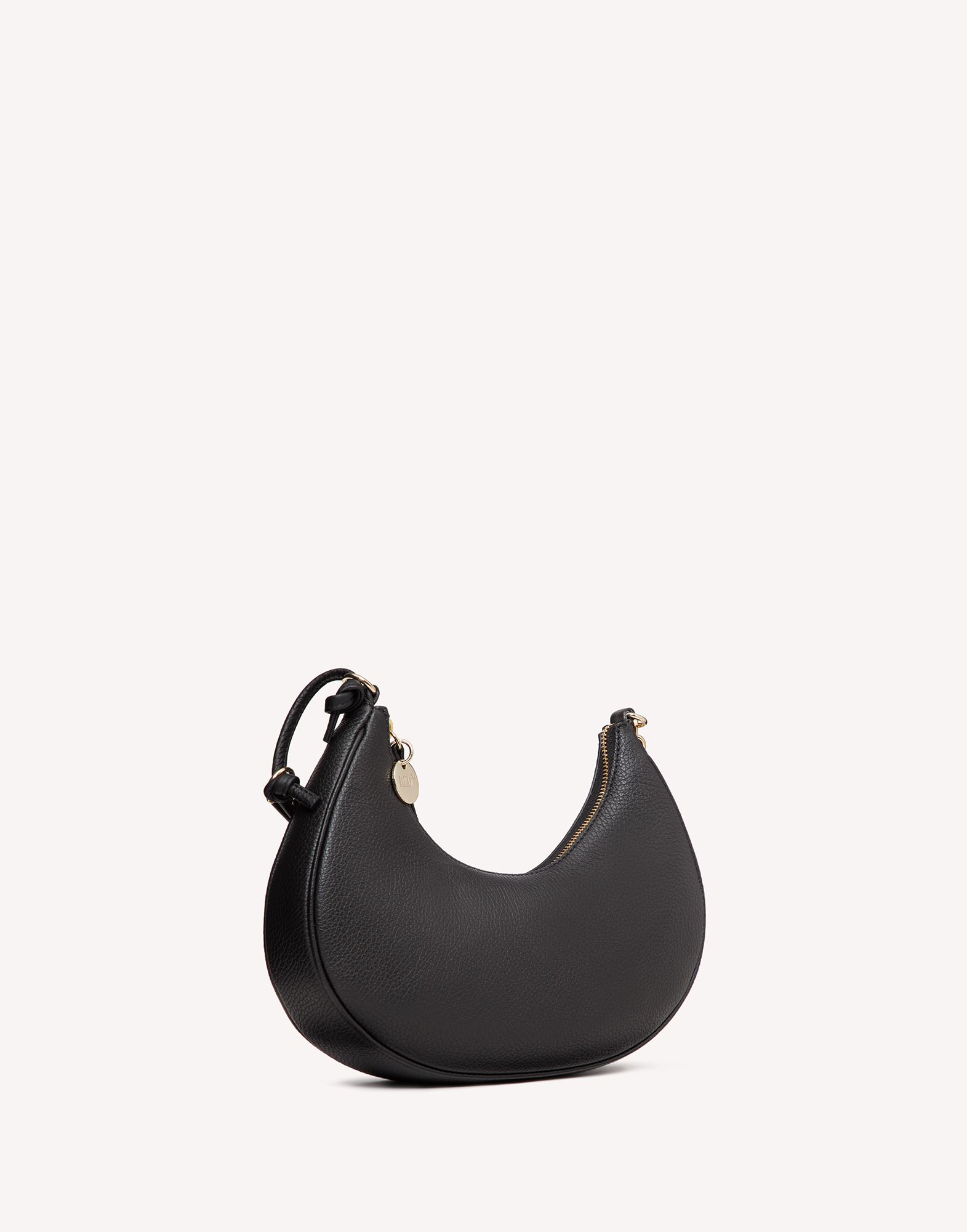 Hobo shoulder bag in grained leather. Non-adjustable and non-removable shoulder strap. Zip closure. Cotton lining printed with the iconic point d'esprit motif. Light gold finishes and metal parts.