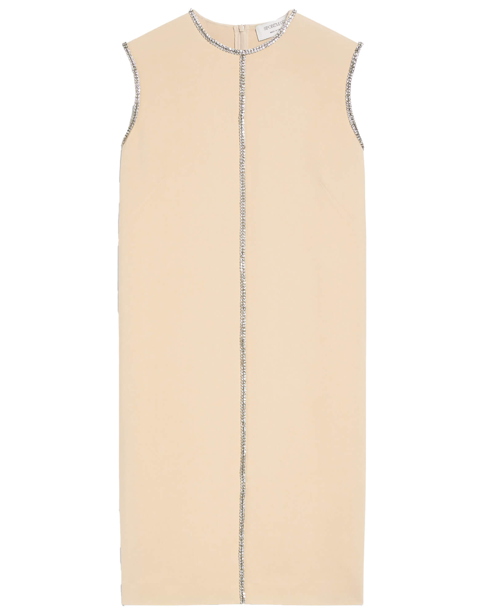 Straight, sleeveless dress made of stretch viscose cady, decorated with a row of rhinestones on the crew neck, sleeve edge and central cut at the front. Diagonal darts on the bust for a feminine fit.