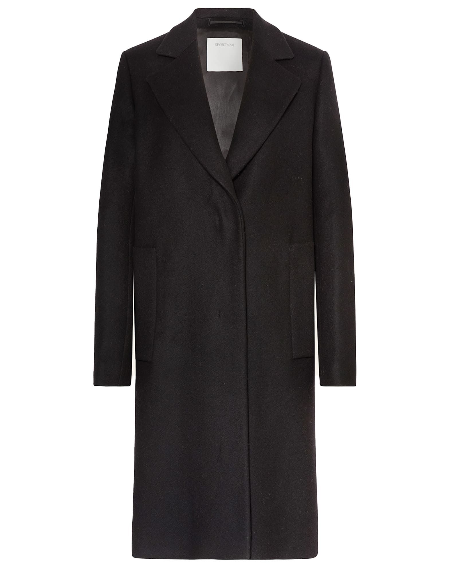 Straight coat with a masculine look in double virgin wool fabric with hidden buttoning and flaps on the front. Slit in the back and at the bottom of the sleeve, lined garment.