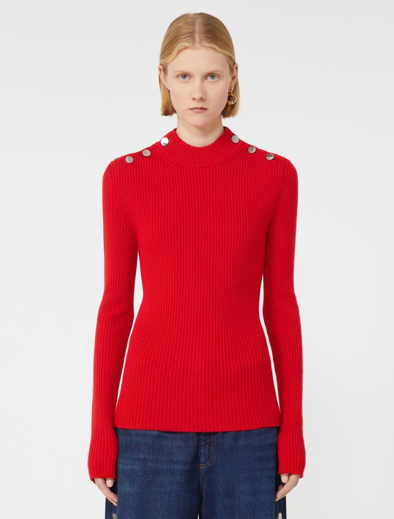 Pure wool ribbed sweater. Fitted fit. Round neckline. Custom metal button motif on the shoulders and along the sleeves. Regular fit.