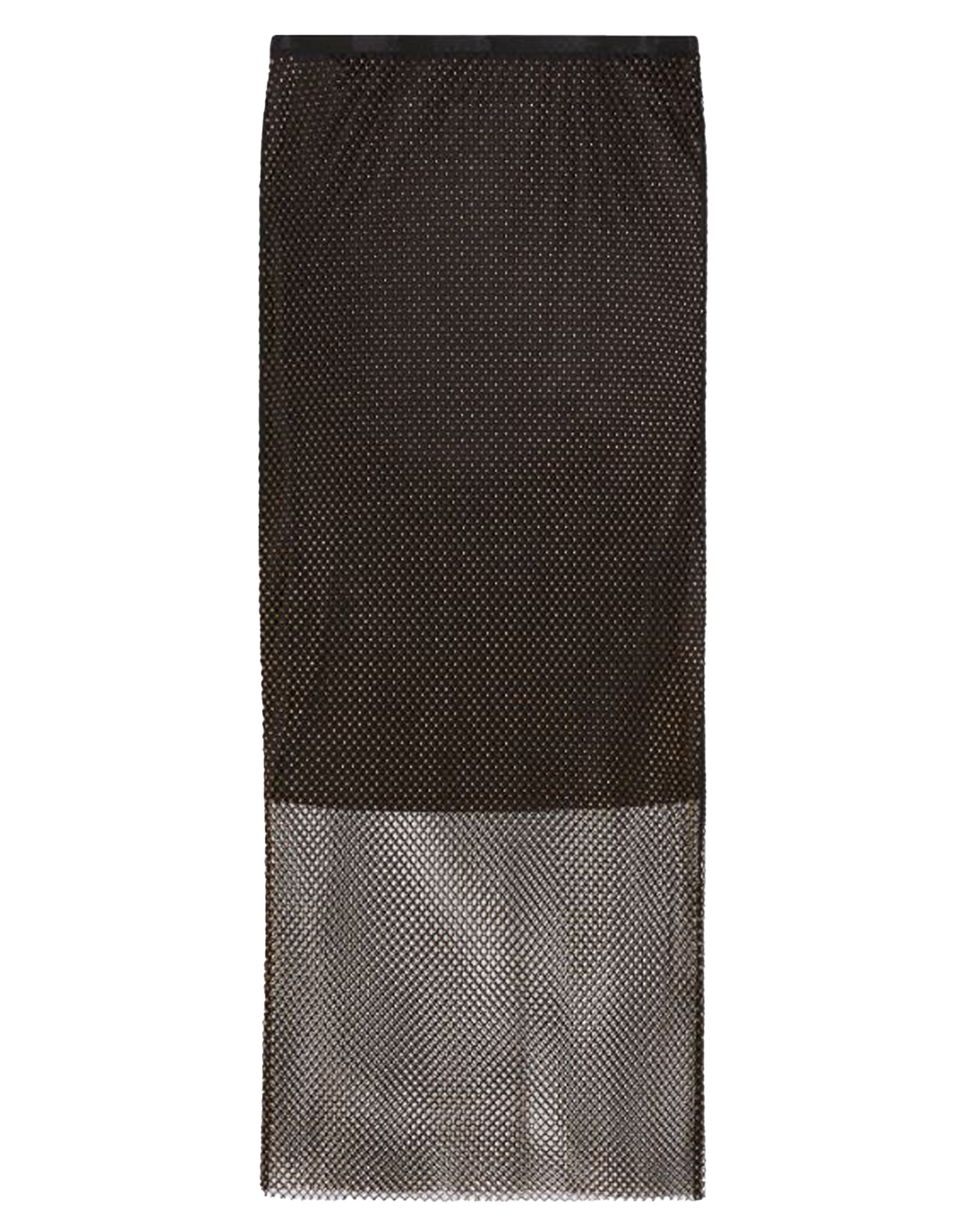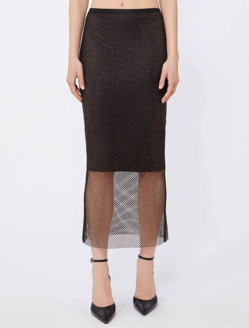 Clean-lined mesh midi skirt with rhinestone appliques. Its minimalist shape is complemented by a matching lining.