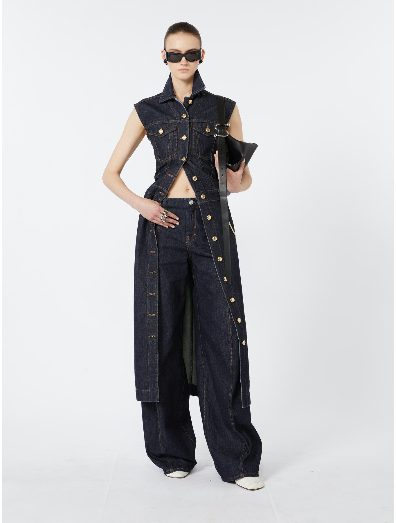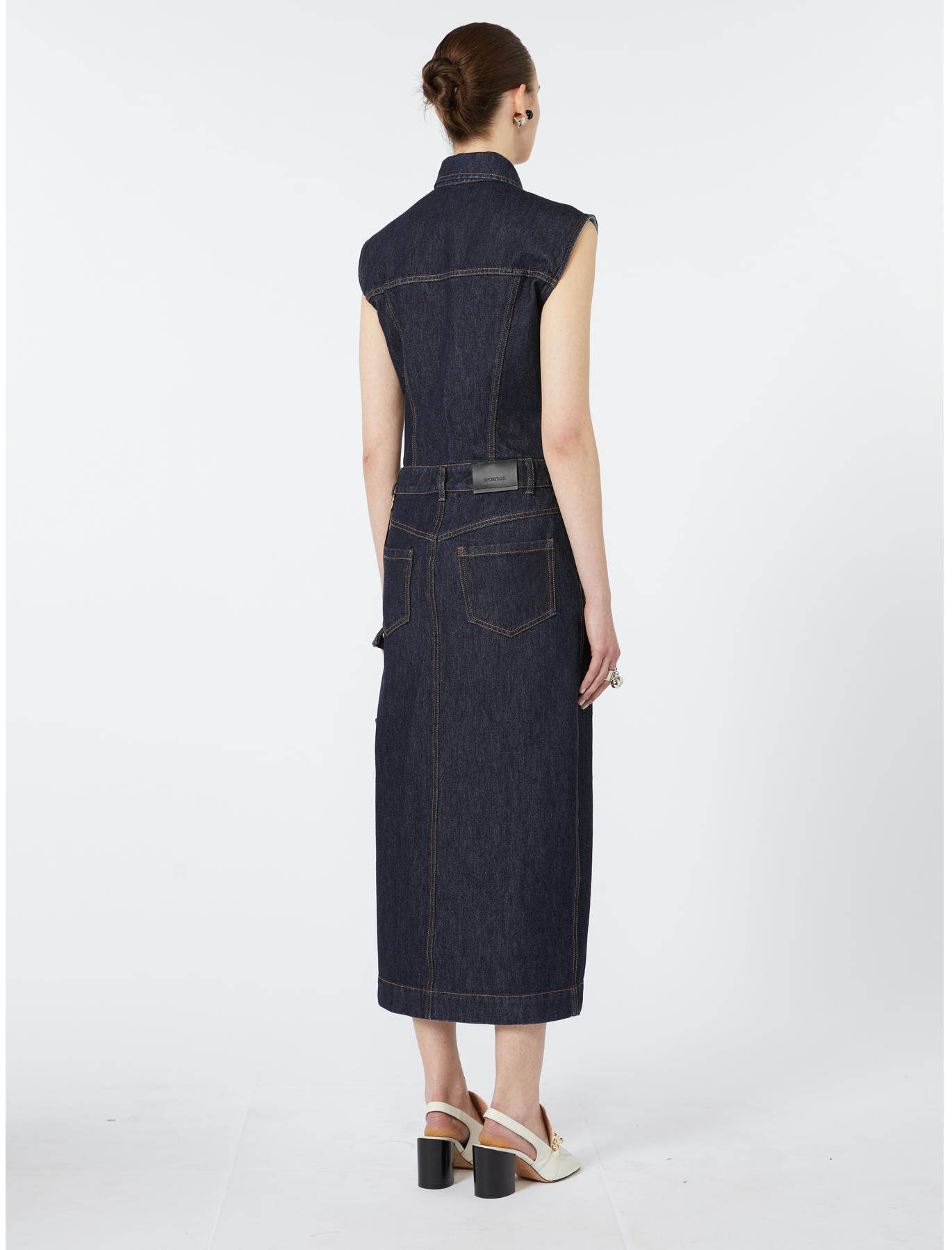 Sleeveless indigo denim shirt dress, combining jacket details on the top and a trouser-style skirt. Contrasting stitching and a removable metal chain add a bold touch to the design. Shirt dress in authentic firm indigo denim with a dark, clean, raw finish. Fitted fit. Shirt collar with exposed button placket. Cutouts and shaping on the bust. Patch pockets on the bust and slash pockets on the hips. Regular fit.
