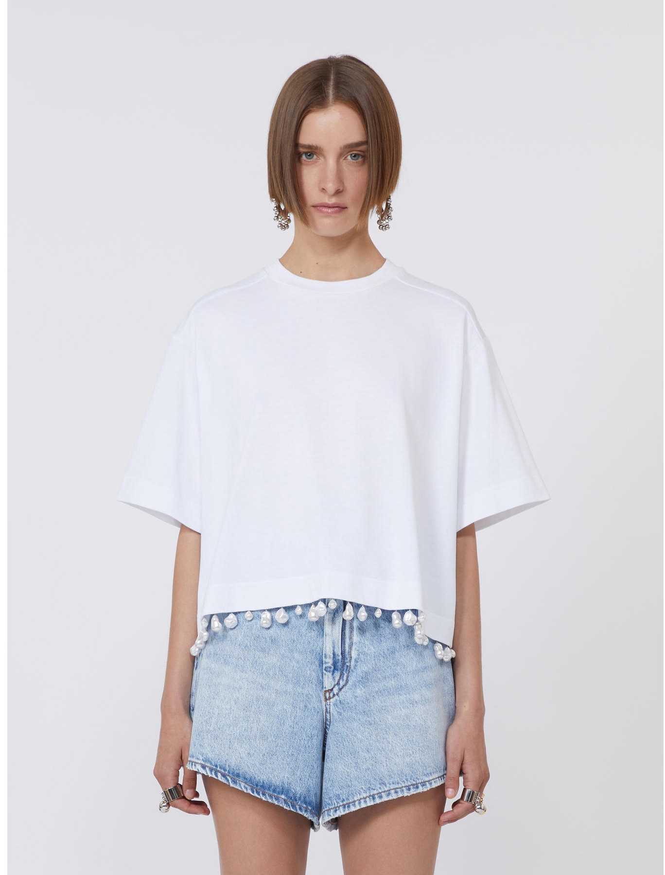 Pure cotton jersey crop T-shirt with a clean cut, dropped shoulders, and a rounded neckline. The hem features three-dimensional baroque pearls on the front and back. Jersey T-shirt. Relaxed fit with a cropped line. Round neckline and short sleeves. Three-dimensional baroque pearl embroidery at the hem. Hand-embroidered. Regular fit.