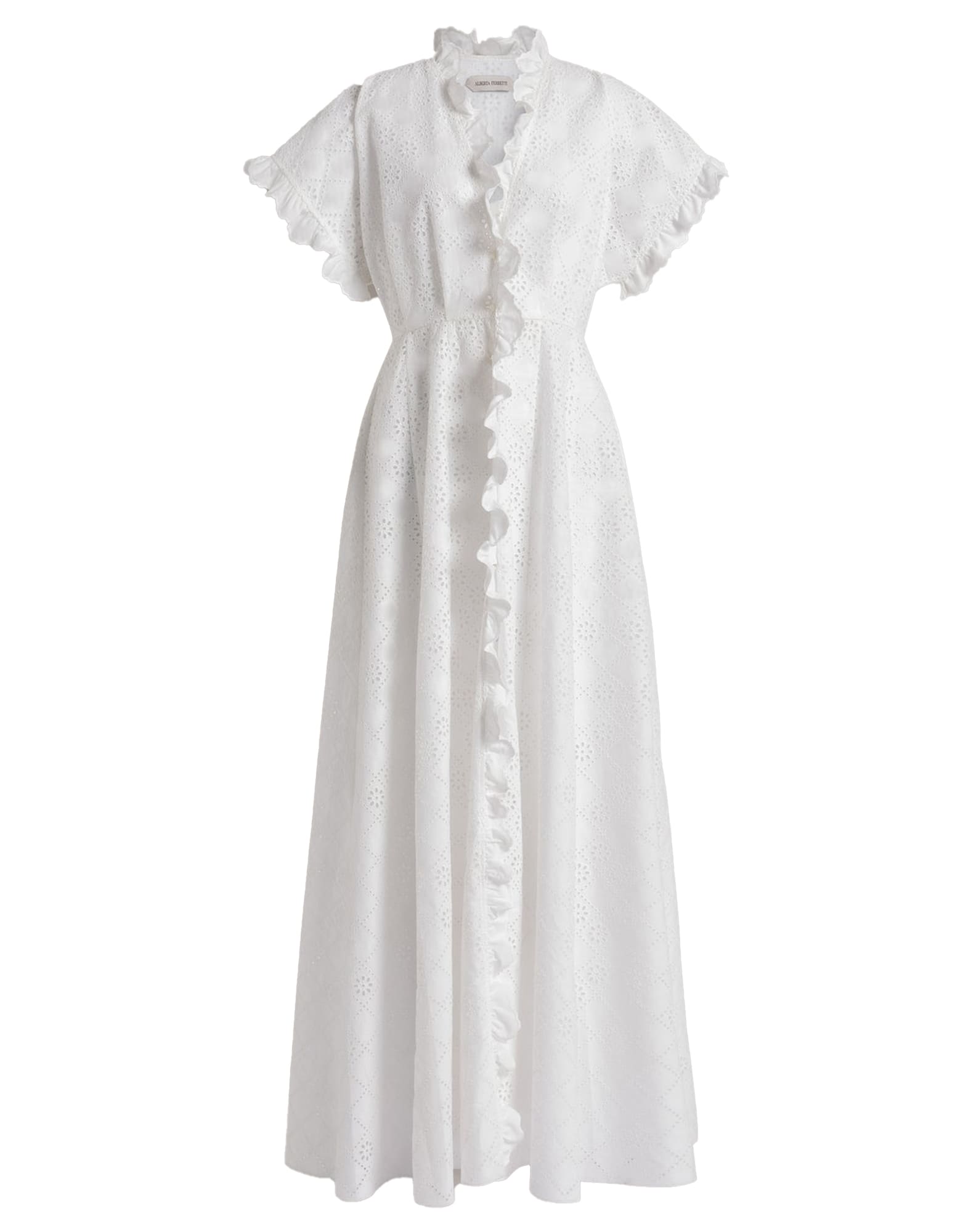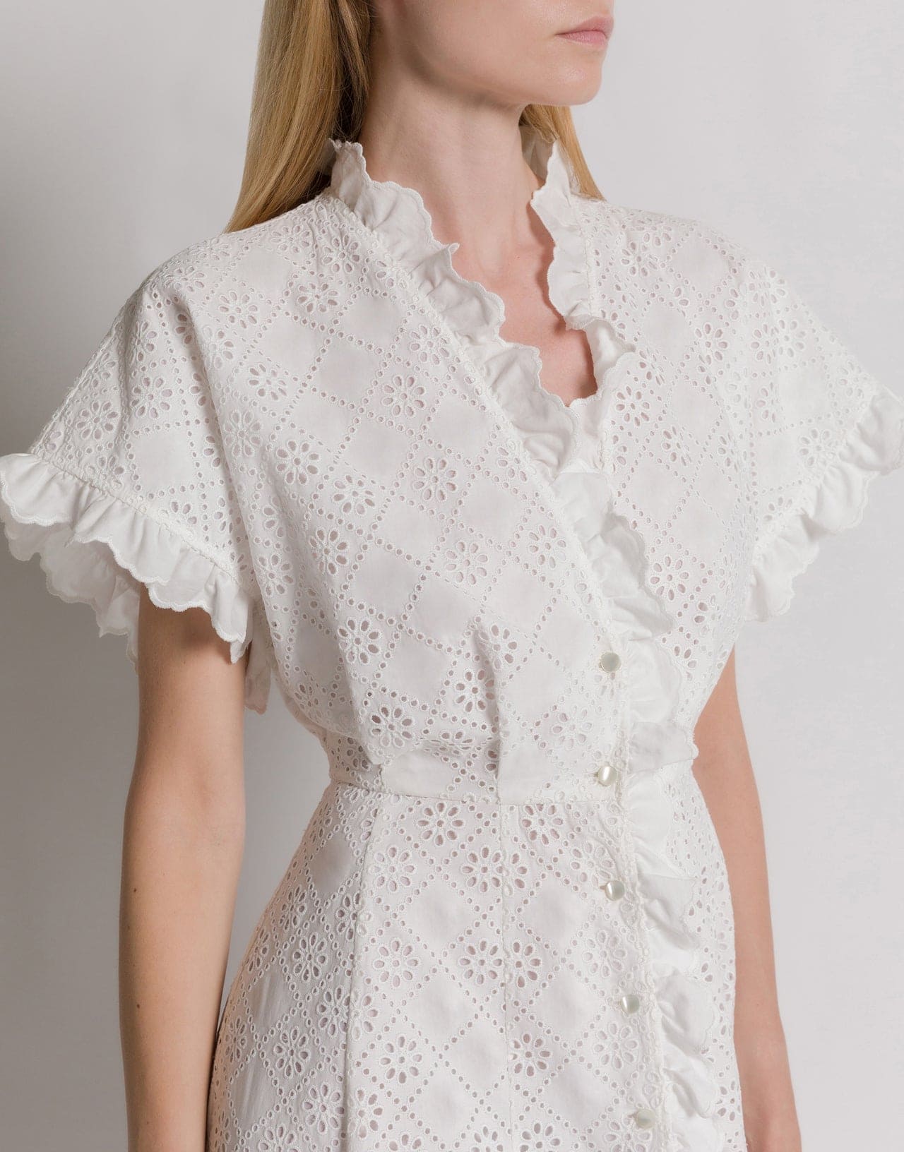 Reinterpretando il classico pizzo Sangallo, questo abito a maniche corte è realizzato in guipure di cotone a motivi floreali con chiusura frontale. Bottoni frontali. Rouches su maniche e lunghezze