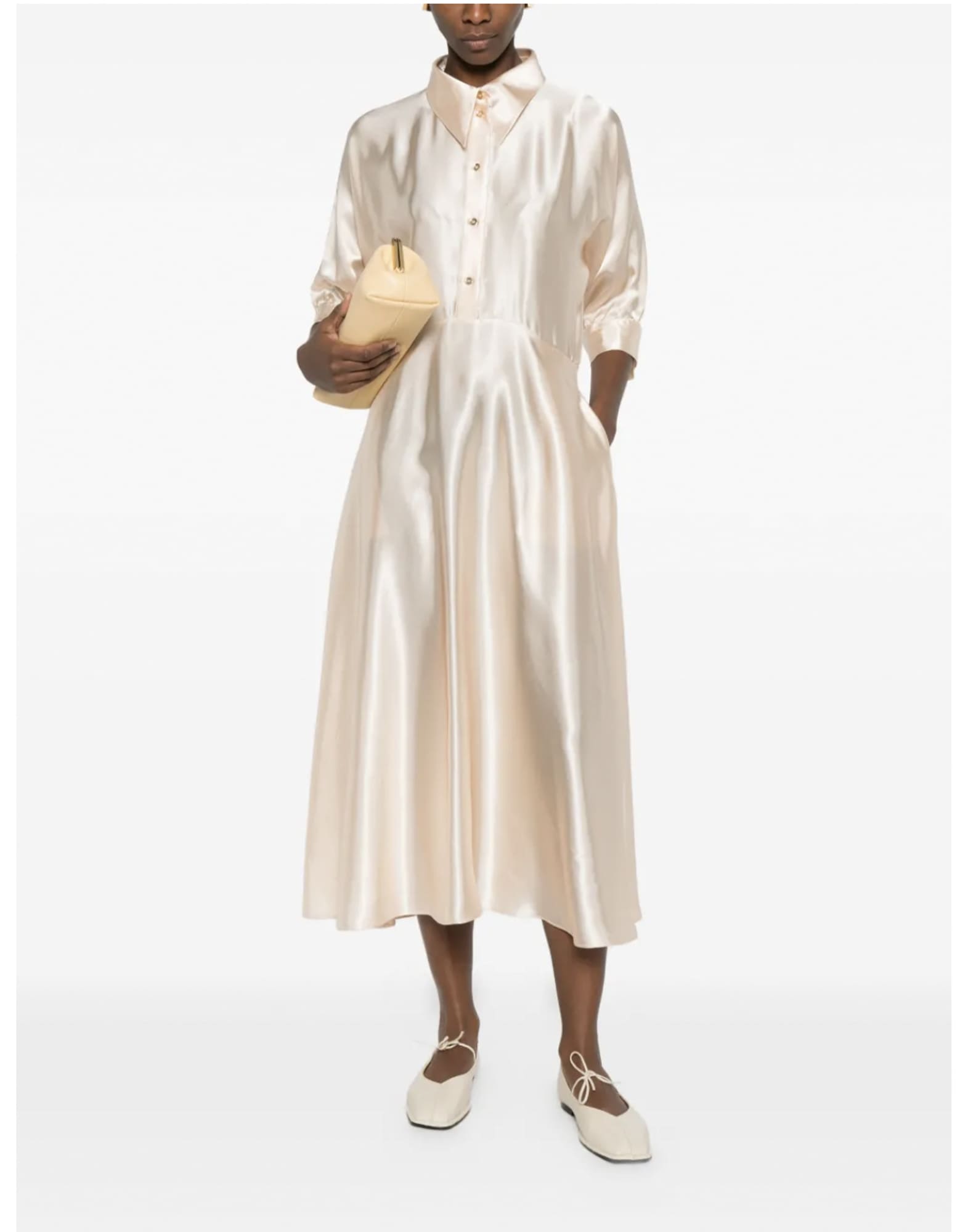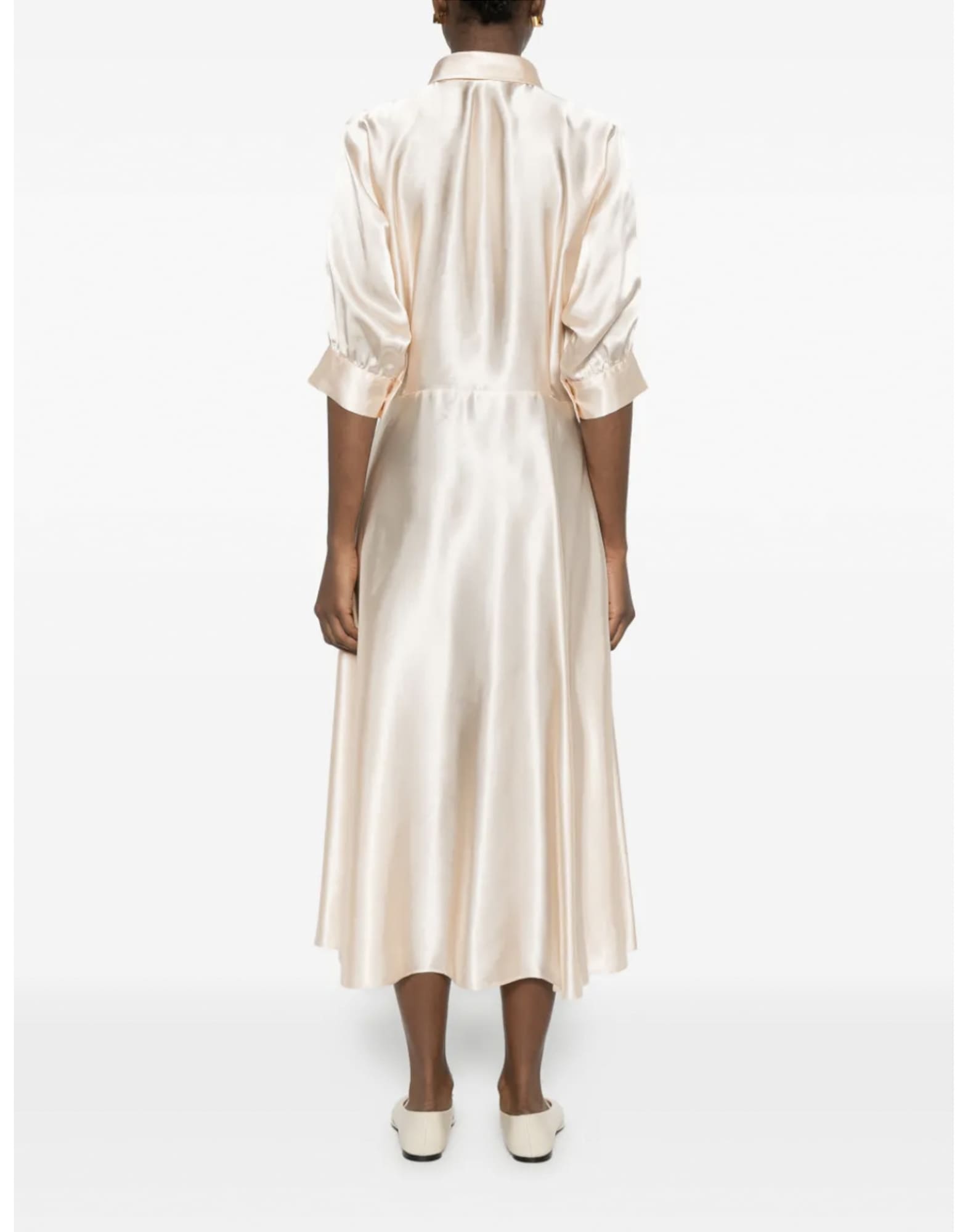 Abito in raso in beige / rosa chiaro, lunghezza midi, manica corta.