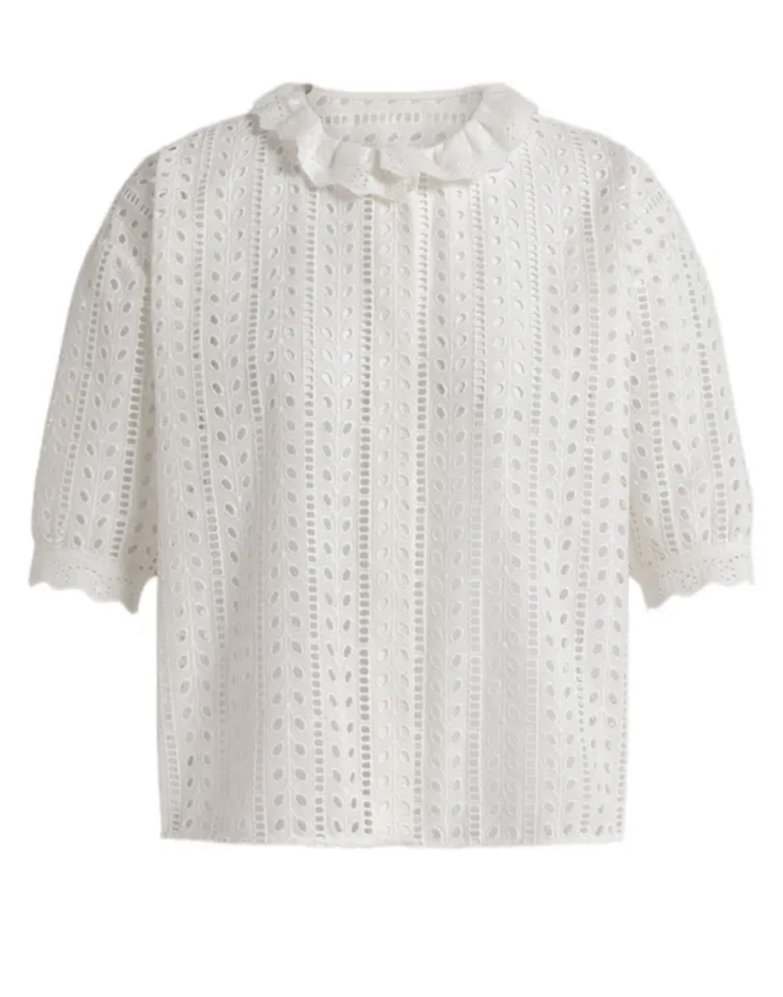 Un classico rivisitato. Questa camicia a maniche corte è realizzata in guipure di cotone con motivi floreali, reinterpretando il tradizionale Sangallo in chiave sofisticata. Perfetta da abbinare alla gonna coordinata per un look elegante e leggero.Maniche corte. Collo classico. Tessuto Sangallo in guipure di cotone