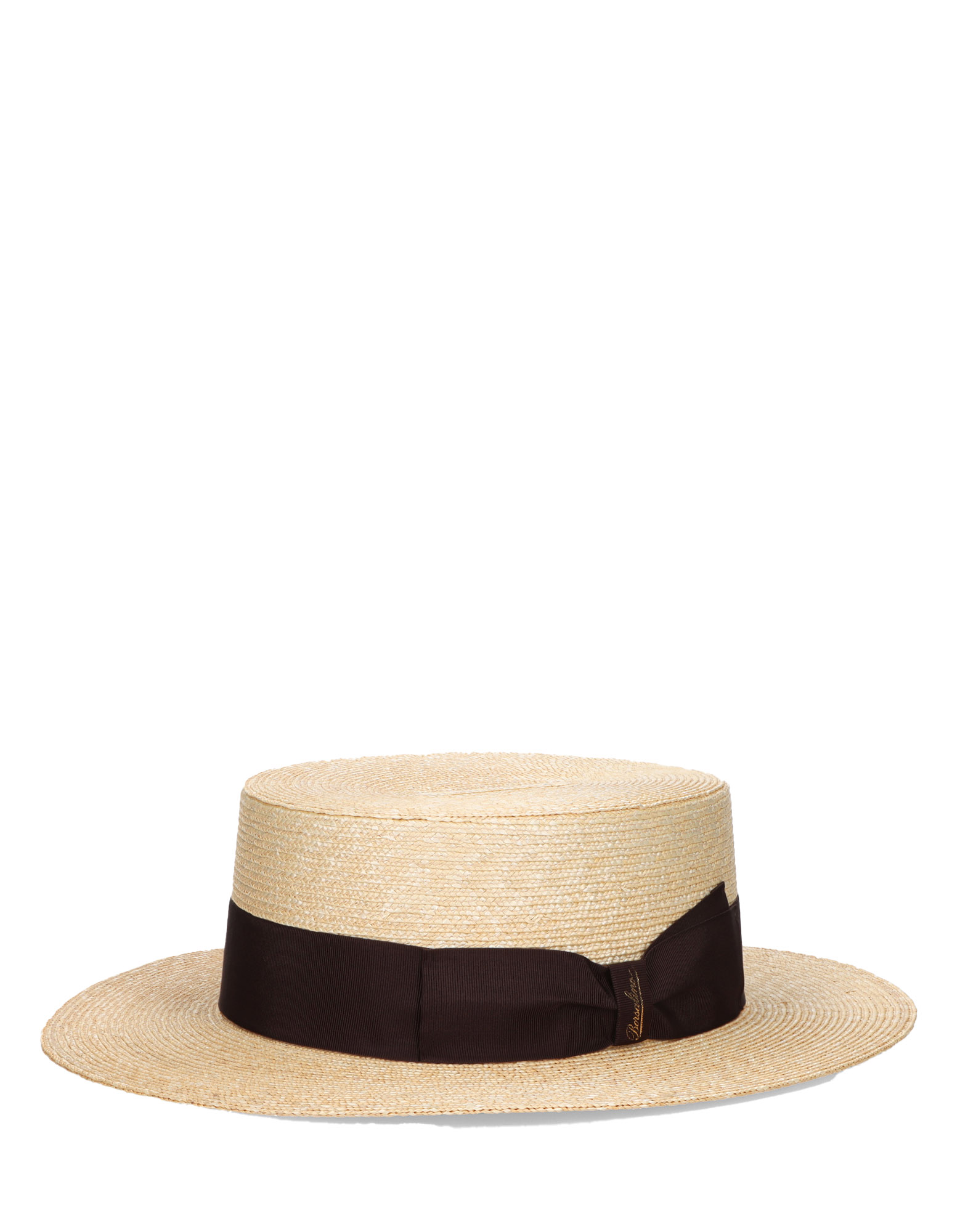 Il cappello Magiostrina è realizzato in treccia di paglia, lavorata intrecciando a mano le fibre essiccate per ottenere una trama uniforme, resistente e flessibile, perfetta per accessori di alta qualità. Questa lavorazione artigianale garantisce un materiale leggero e durevole. La forma della Magiostrina si distingue per la corona bassa e ben proporzionata, abbinata a una tesa piatta e ben strutturata. È arricchita da un gaucho con sottogola che permette di indossare questo capo comodamente anche sulle spalle. Il design del cappello è completato da una cinta in canneté di 4 cm. La tesa media misura circa 5,5 cm. Disponibile in colore unico.