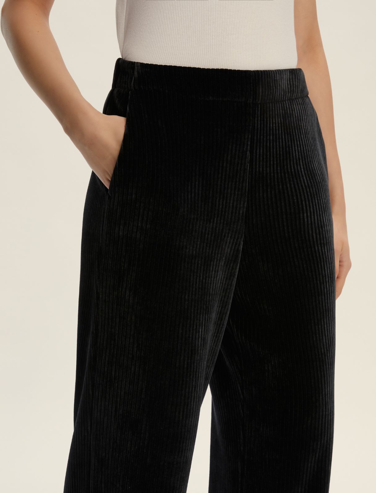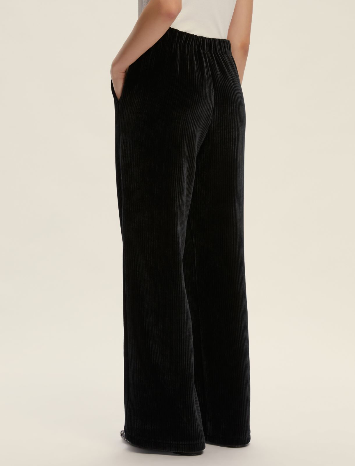 Pantalone in jersey velluto a coste. Fit dritto. Inserto elastico sul retro della vita. Tasche laterali alla francese