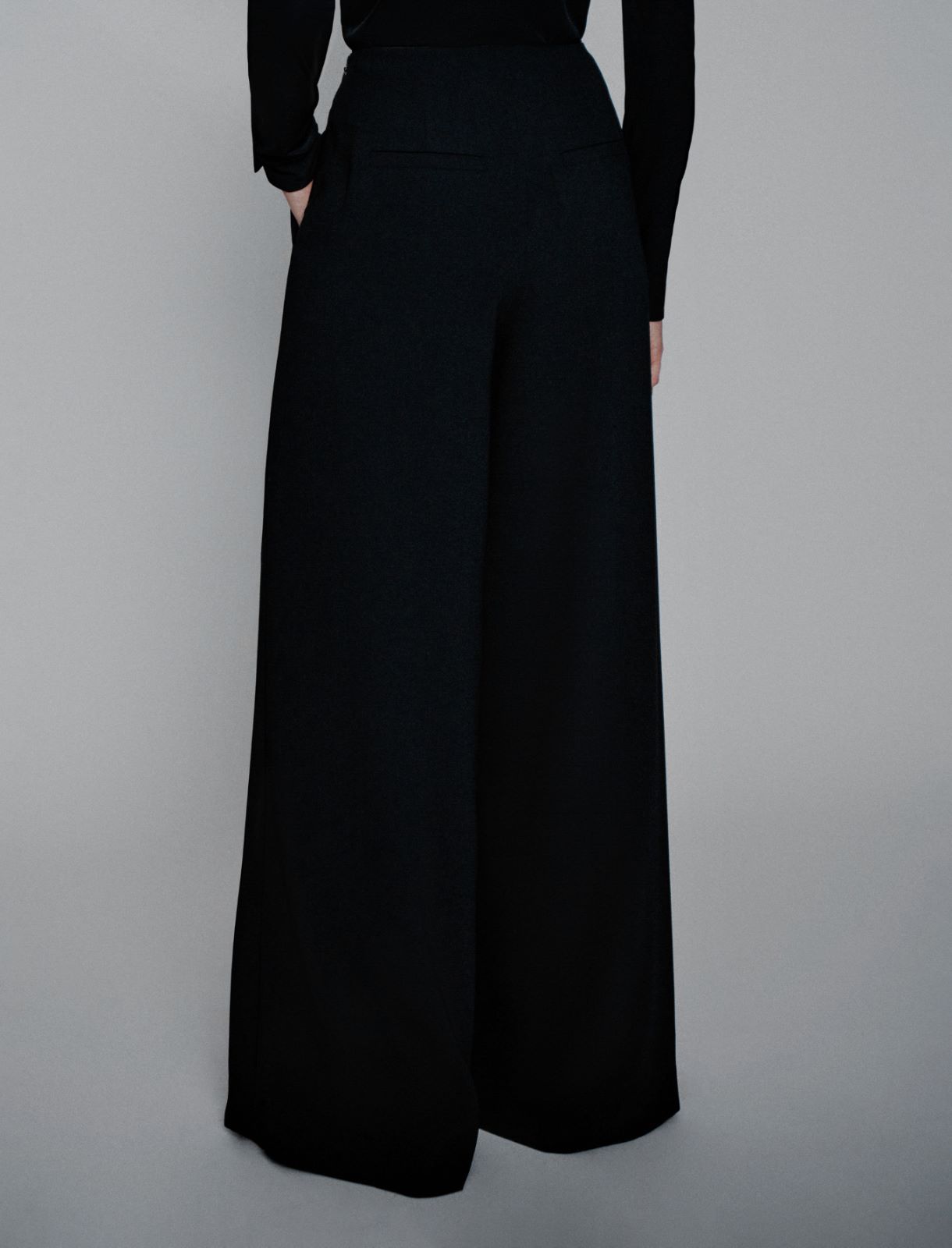 Pantalone in crêpe envers satin. Fit ampio. Chiusura con zip laterale. Tasche laterali alla francese e posteriore a filetto