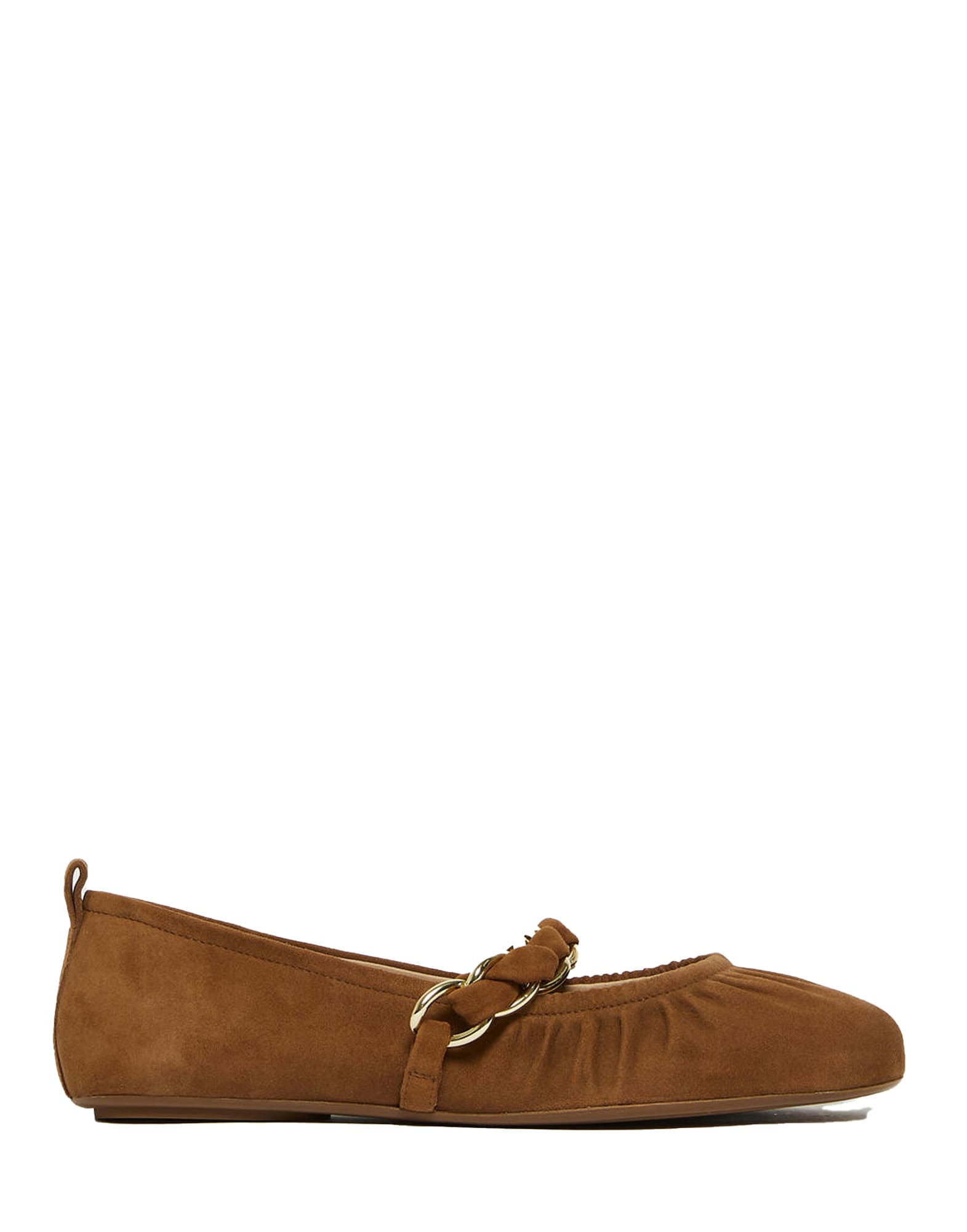 Ballerina in suede. Motivo di catena intrecciata. Scollo arricciato. Fodera e sottopiede in pelle, con etichetta Marella. Suola in gomma