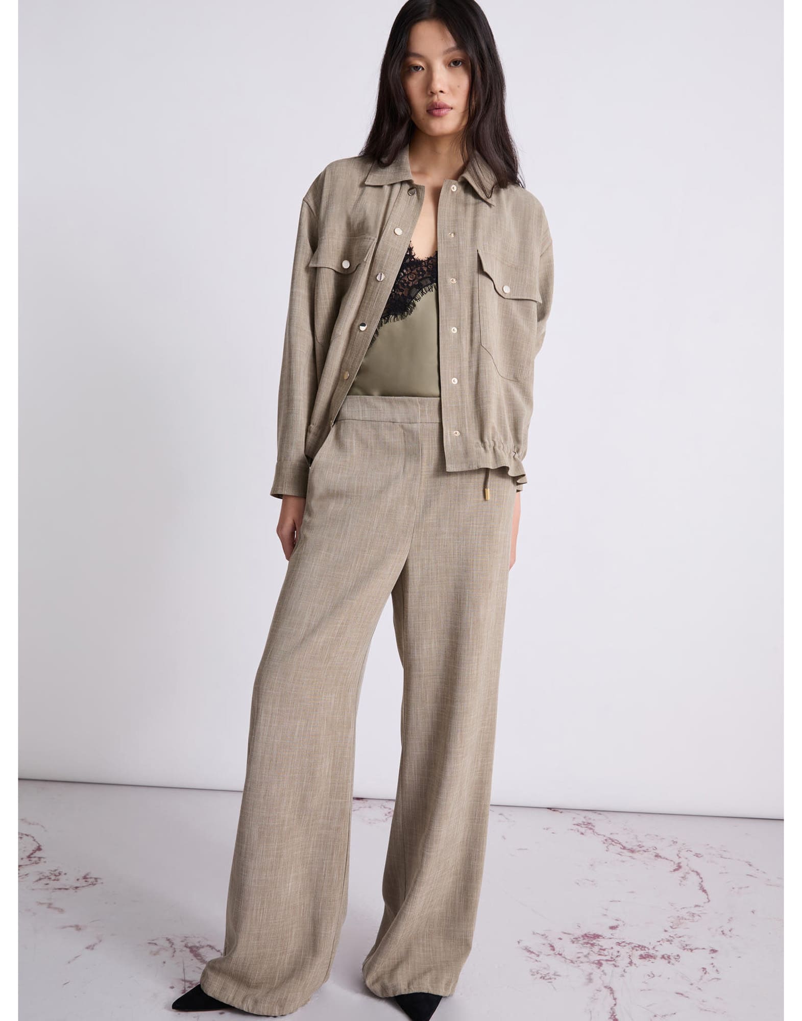 Pantalone wide leg in tinto filo fluido stretch, vestibilità loose, coulisse interna al fondo gamba con fermacoulisse in metallo galvanica oro chiaro, tasche alla francese, chiusura davanti con gancio a uomo e zip nel cintone interno, elastico nel cintone interno dietro, fodera all'interno delle tasche.