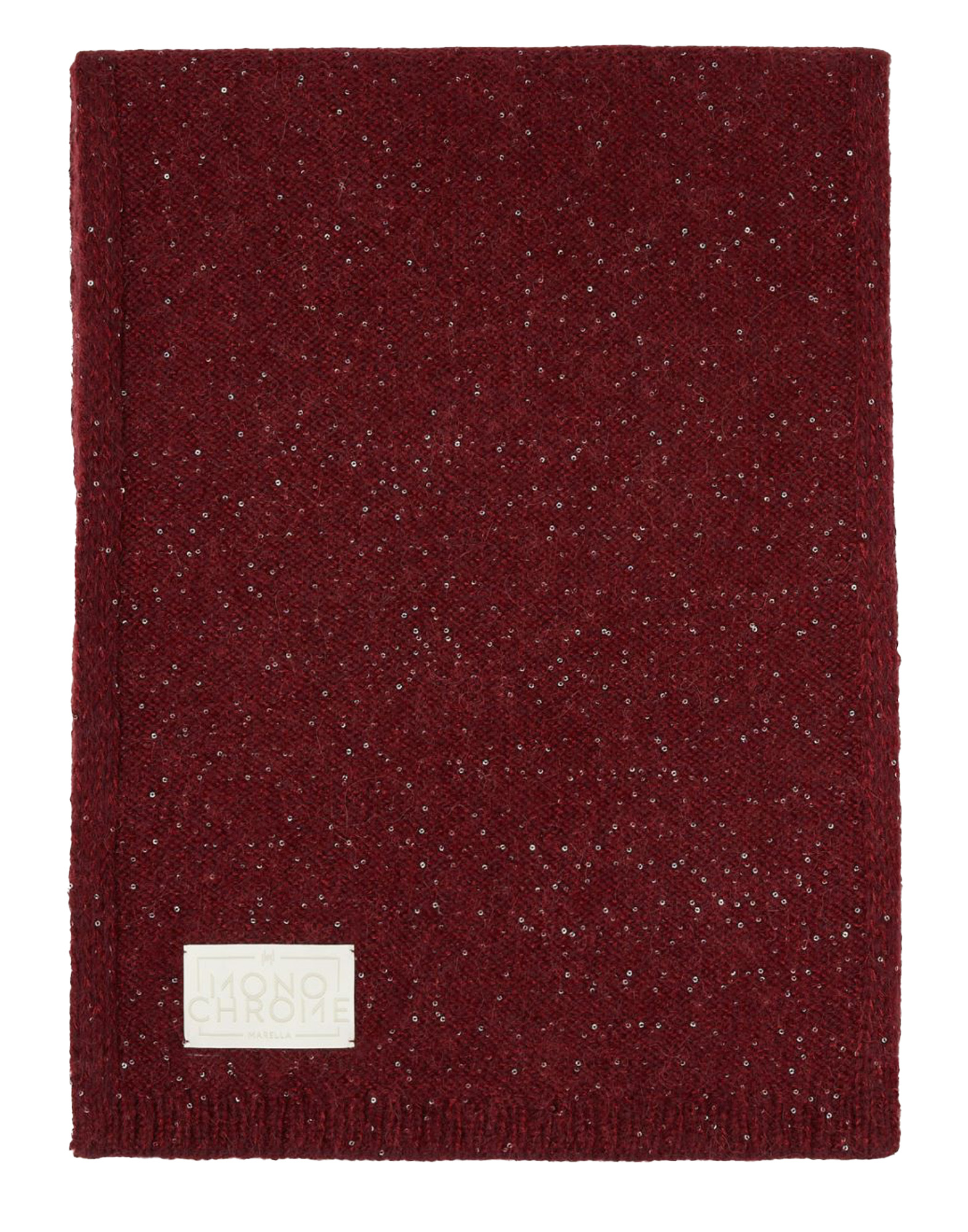 Sciarpa in misto cashmere con paillette e filo di lurex. Etichetta personalizzata applicata. Dettaglio a coste sui lati corti. Misura: 40 x 220 cm