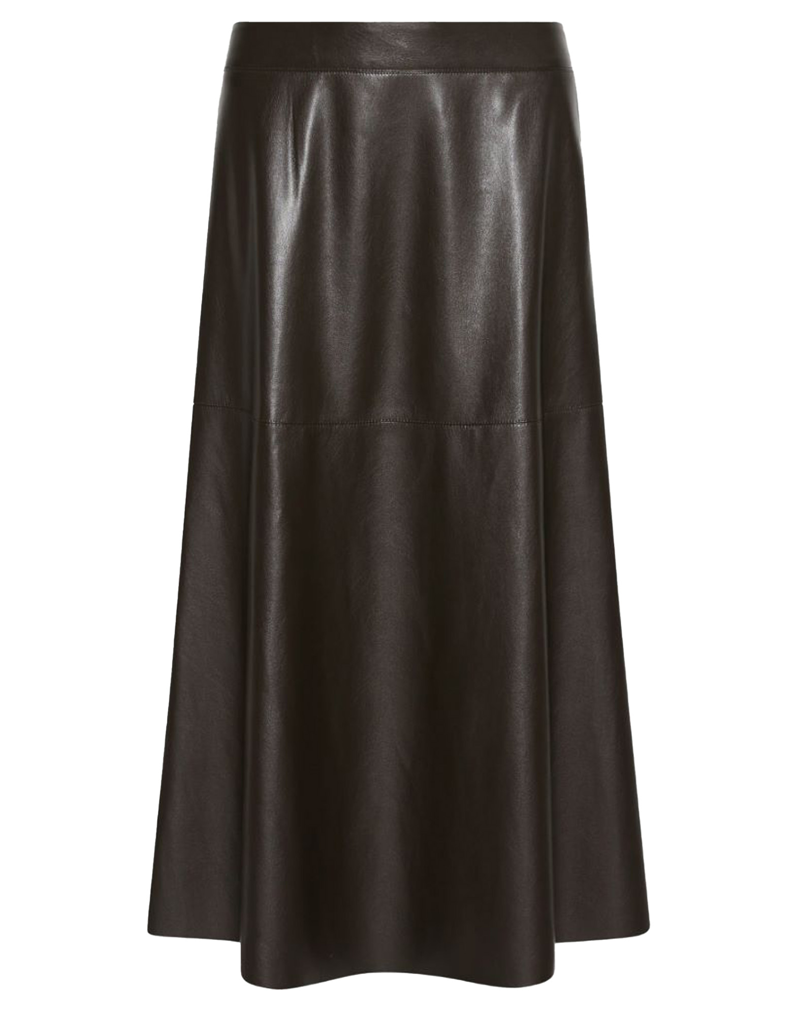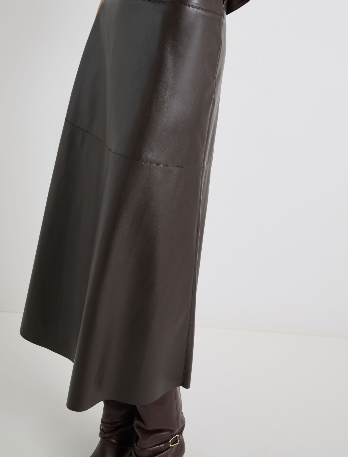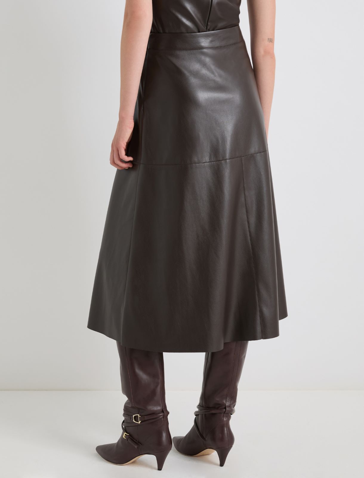 Gonna midi in jersey spalmato effetto pelle, linea aderente sui fianchi che si svasa al fondo, motivo di taglio orizzontale e di impunture sul capo, chiusura con zip invisibile su lato sinistro indossato.