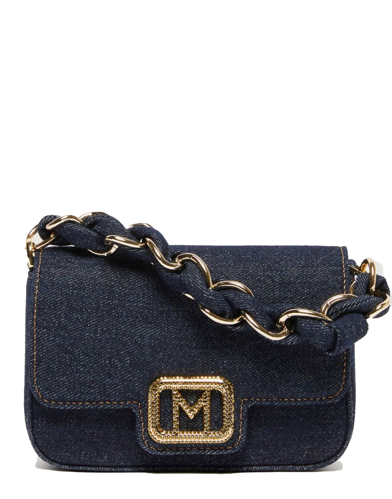 La collezione Le Muse: borse dal design iconico che uniscono stile e funzionalità. Un accessorio versatile pensato per chi cerca eleganza e praticità in un unico dettaglio. Borsa Le Muse piccola in tessuto denim. Manico intrecciato con catena in metallo. Fodera personalizzata. Portata a mano e cross body con tracolla lunga rimovibile. Chiusura a patta con calamita e placca logata con strass.