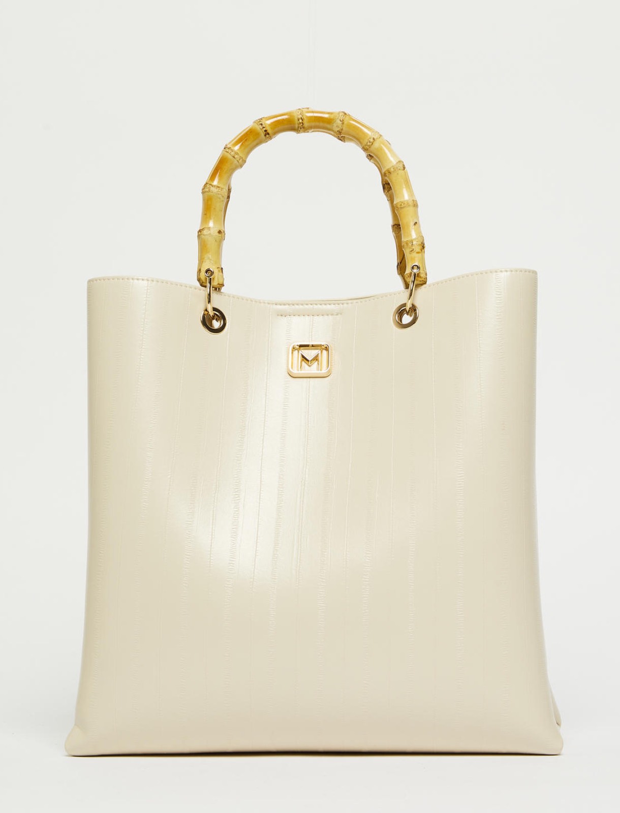 Shopper in tessuto spalmato con stampa rettile. Doppi manici in bambù. Portata a mano e cross body con tracolla lunga rimovibile. Tramezza interna con tasca zippata. Logo in metallo con finitura oro chiaro.