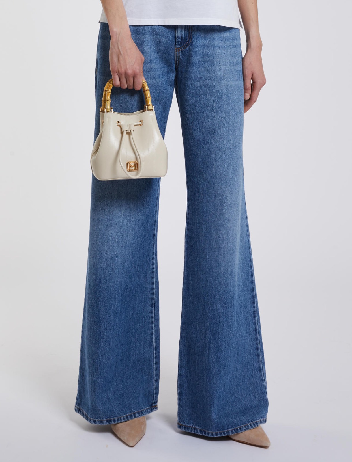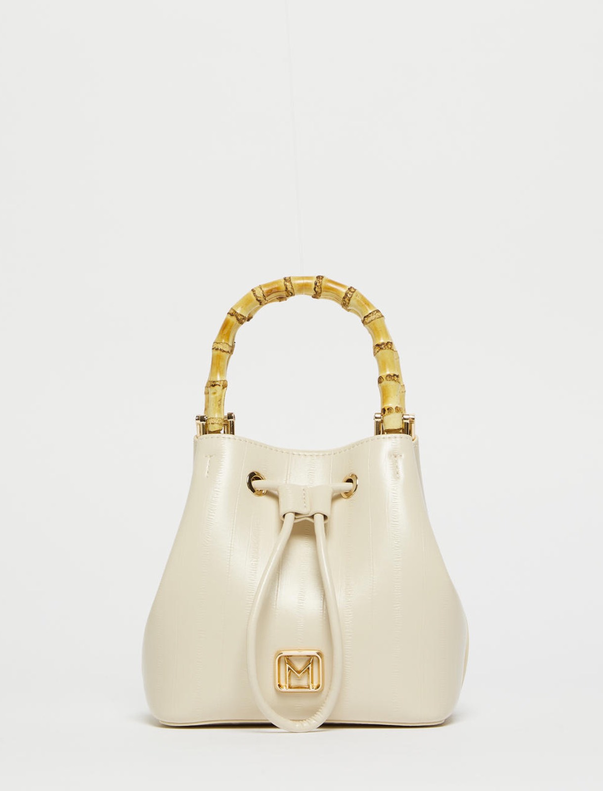 Borsa a secchiello in tessuto spalmato con stampa rettile. Doppi manici in bambù. Portata a mano e cross body con tracolla lunga rimovibile. Fodera in jersey morbido e vellutato. Logo in metallo con finitura oro chiaro
