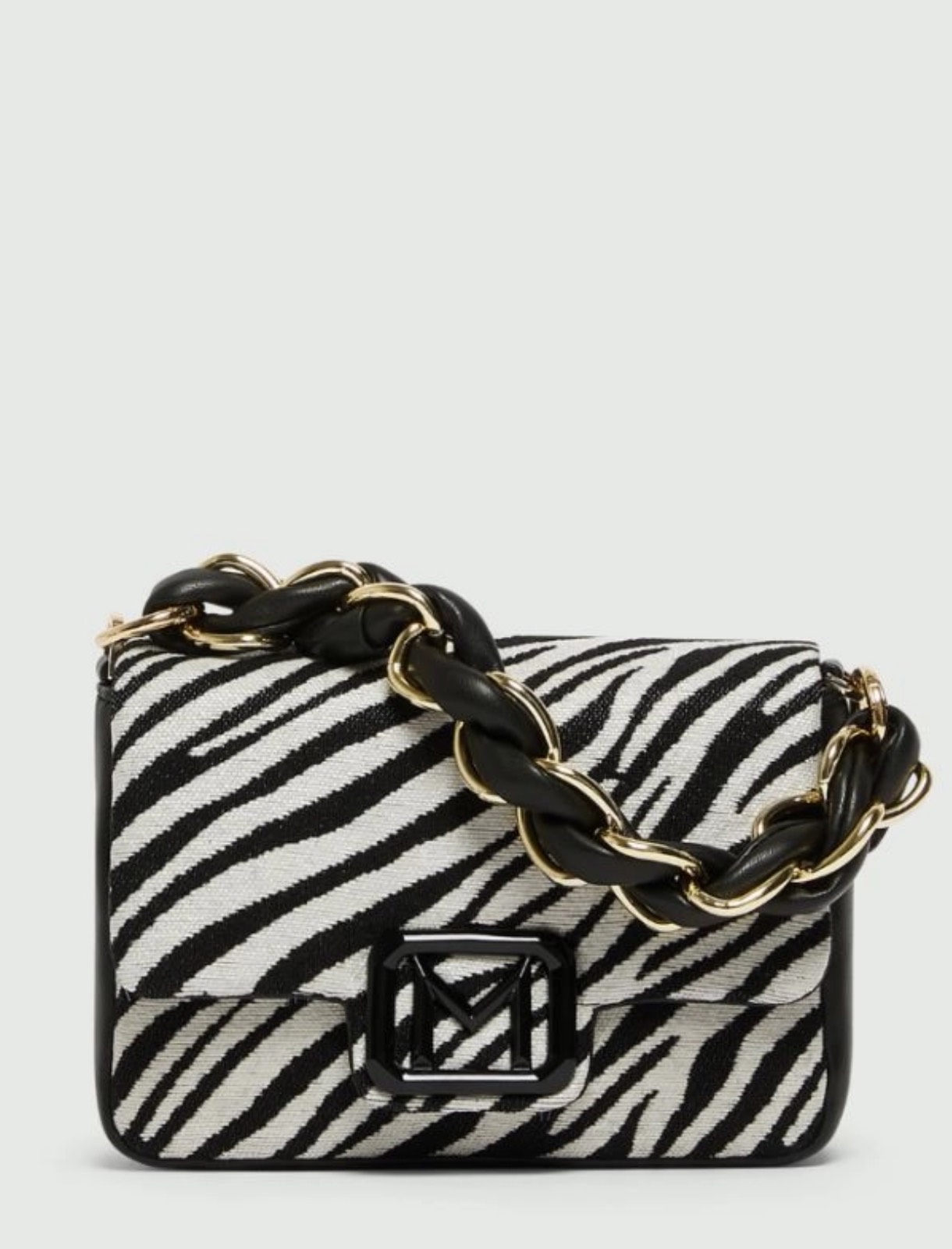 Borsa Le Muse in tessuto jacquard con fantasia animalier e placca logata verniciata on tone. Manico intrecciato con catena in metallo. Fodera personalizzata. Portata a mano e cross body con tracolla lunga rimovibile. Chiusura a patta con calamita e placca logata. Dimensione: 17 x 6 x 11 cm