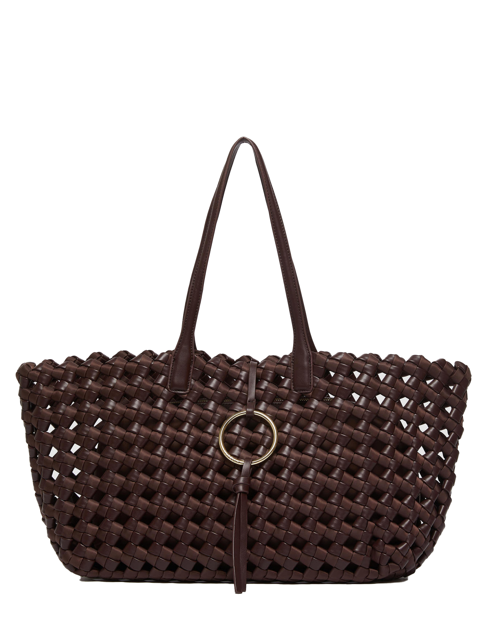 Borsa shopping in tessuto spalmato e tessuto intrecciato. Modello sfoderato. Clutch interna in tessuto con zip. Chiusura con laccio e anello in finitura oro chiaro.