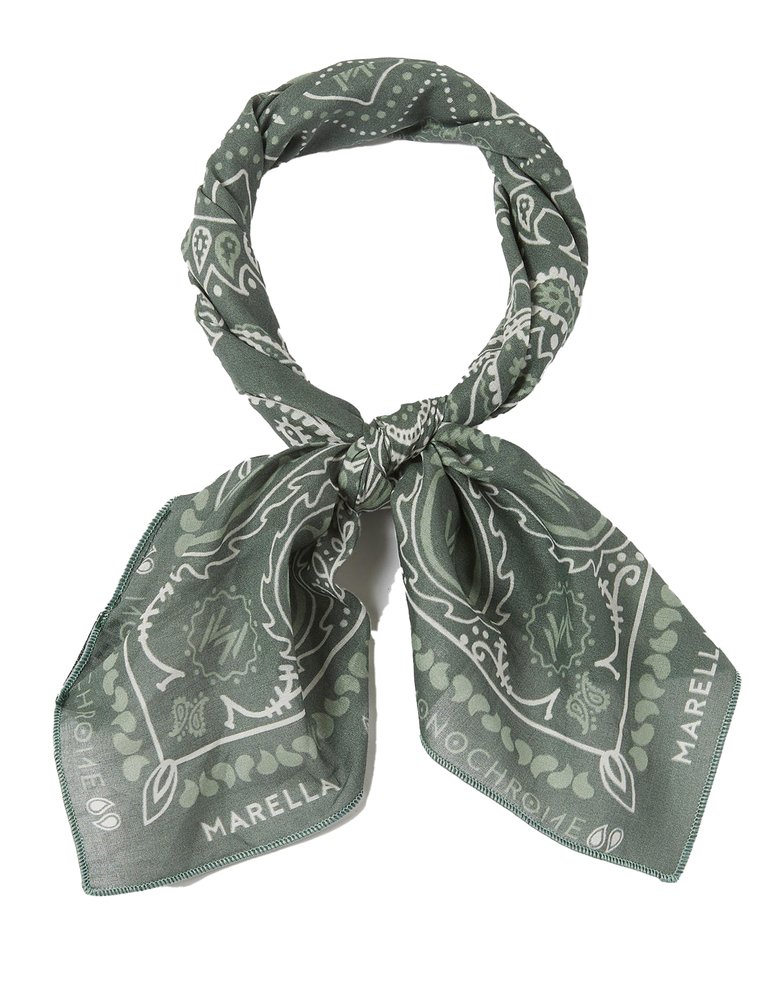 Foulard in cotone leggero con stampa bandana. Bordo con ricamo in filo. Dimensioni: 58 x 58 cm. Con confezione personalizzata Marella monochrome.