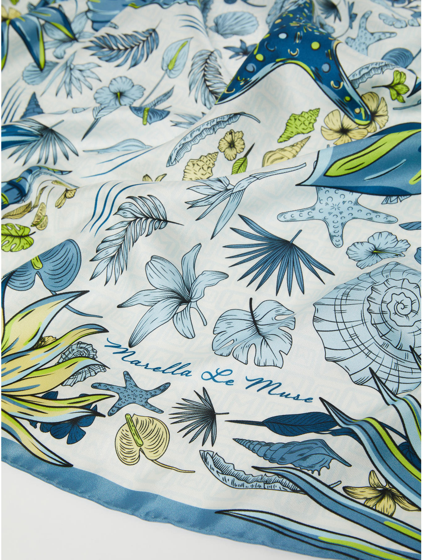 Foulard in twill di seta con stampa Marella Le Muse. Bordo rifinito a mano. Consegnato con confezione personalizzata. Dimensione: 90 x 90 cm