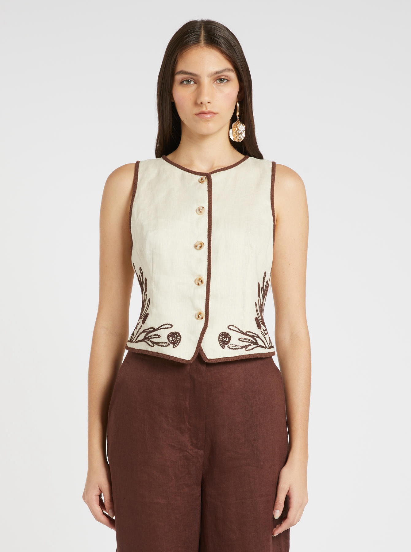 Si indossa a pelle come un top smanicato questo nuovo gilet in puro lino, decorato da bordi e ricami a contrasto colore. Foderato, per un comfort da indossare tutto il giorno.
