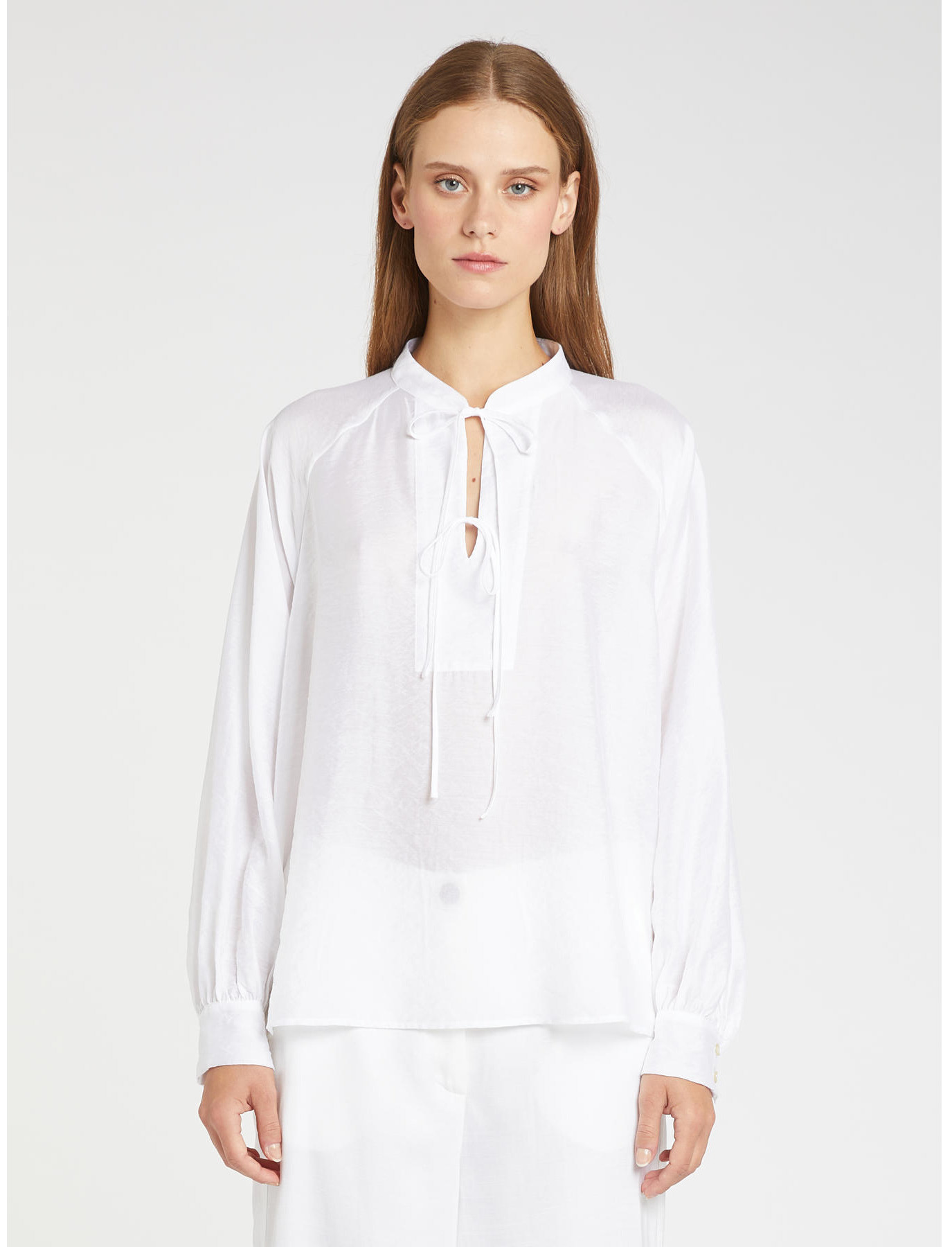 Camicia in misto modal. Fit regolare. Collo alla coreana con laccetti e goccia. Manica raglan con polso