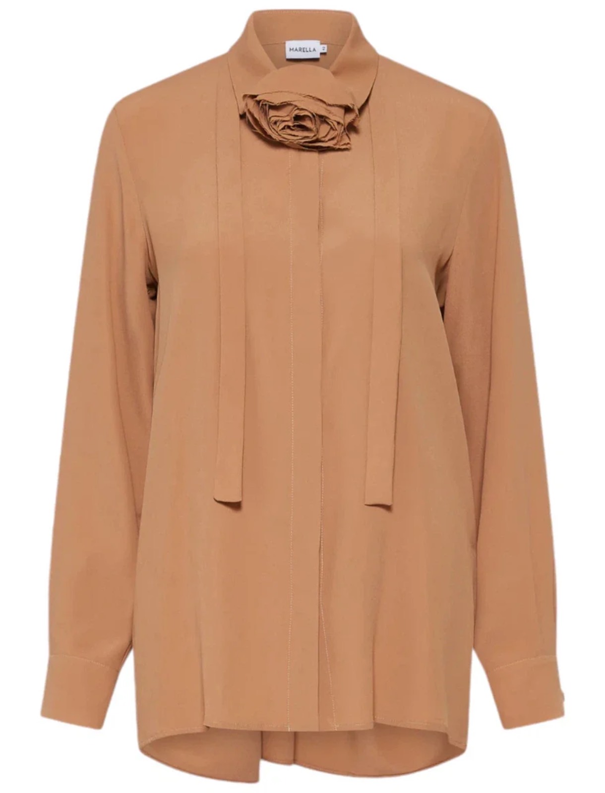 Camicia in crêpe de Chine di misto seta. Fit regolare. Collo a camicia. Abbottonatura nascosta. Cintura con fiore in tessuto.