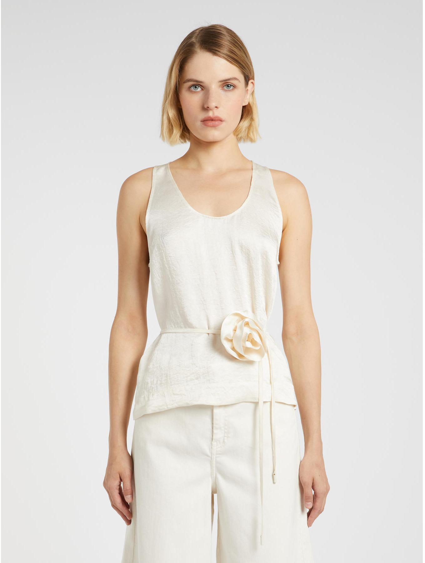 La superficie materica del twill crinckle regala un'allure sofisticata a questo top. Da completare con fiore in tessuto da annodare al collo o in vita, in un gioco di dettagli romantici. Marella monochorme. Top in twill crinckle. Fit svasato. Scollo stondato sul davanti. Spacchetti laterali. Fiore abbinato in tessuto