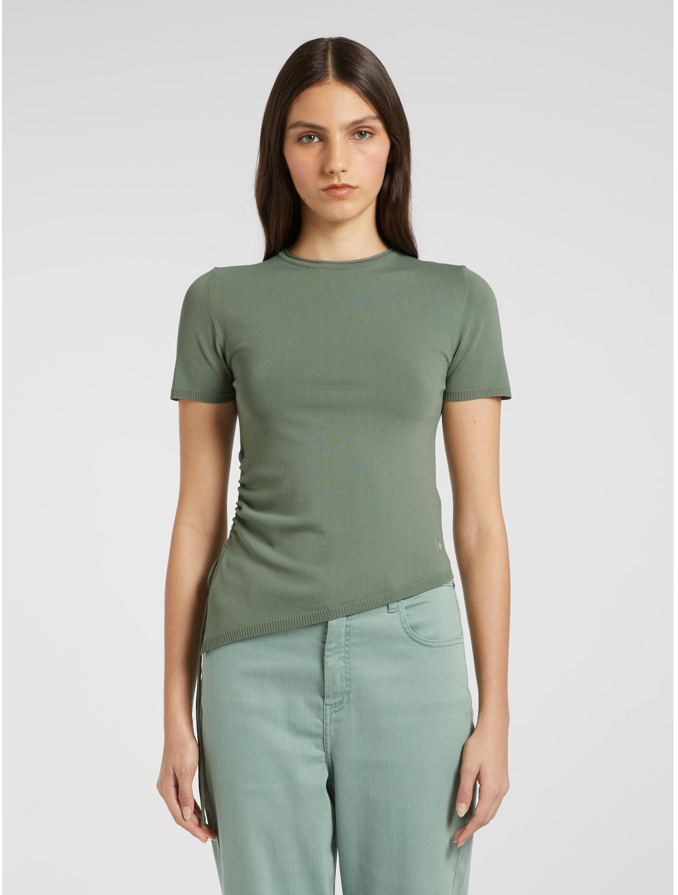 Maglia leggera dal finish luminoso, con manica corta e linee essenziali per una perfetta versatilità. La coulisse sul fianco permette di arricciare dolcemente le linee, per un effetto asimmetrico e personalizzato.