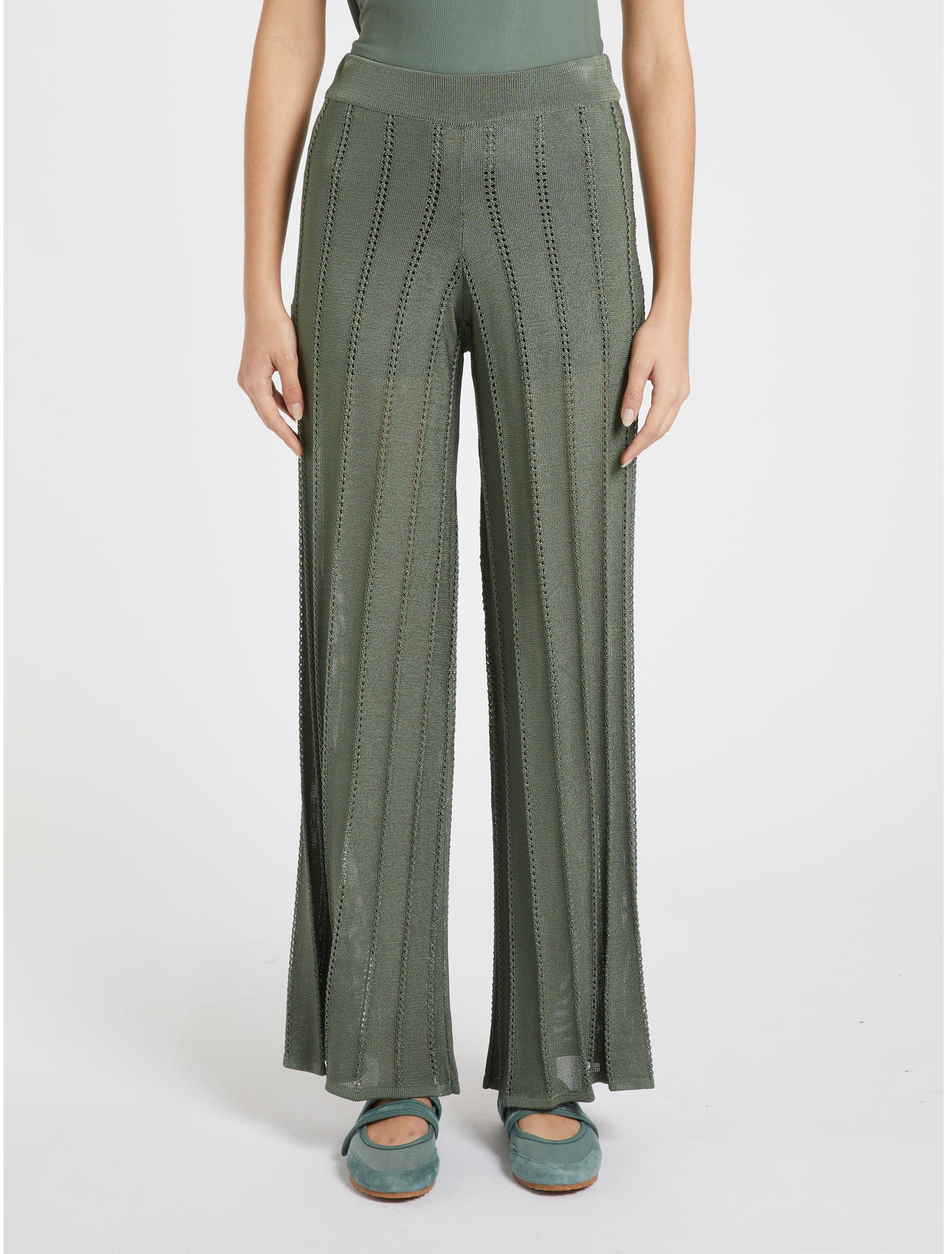Pantalone lungo in maglia, filato viscosa fluida shiny, finezza 9, rasato, motivi coste traforate, linea svasata, cintone elastico, Marella monochrome, coulotte in fodera-
