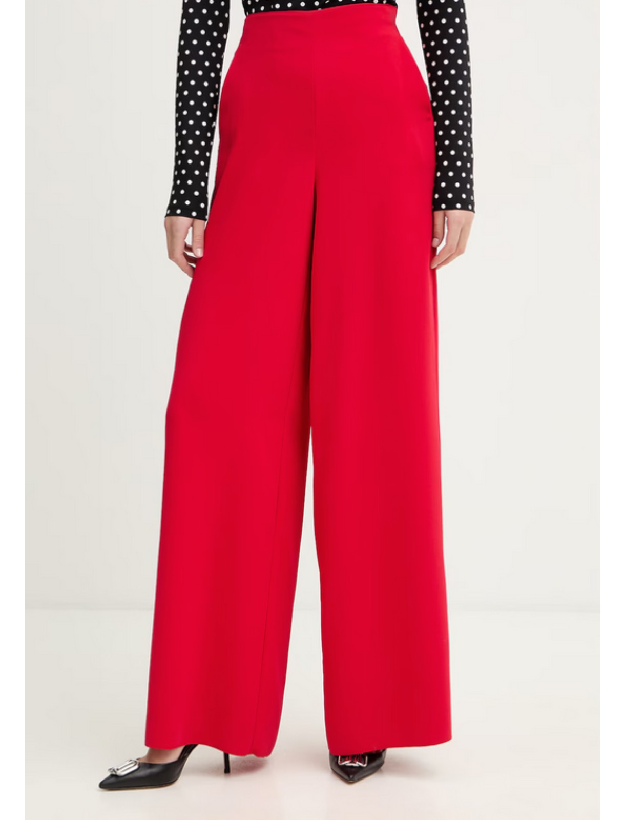 Pantalone in crêpe envers satin. Fit ampio. Chiusura con zip laterale. Tasche laterali alla francese e posteriore a filetto